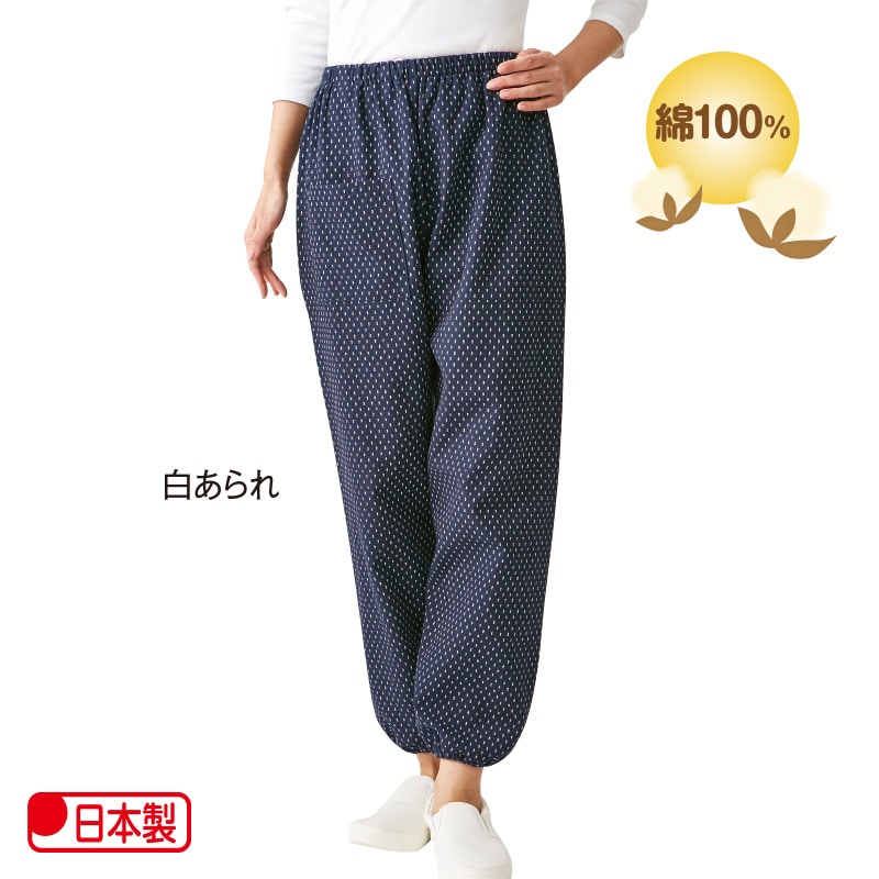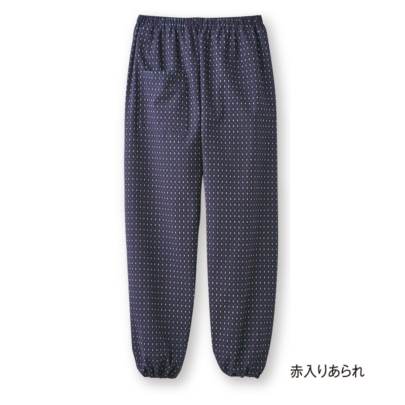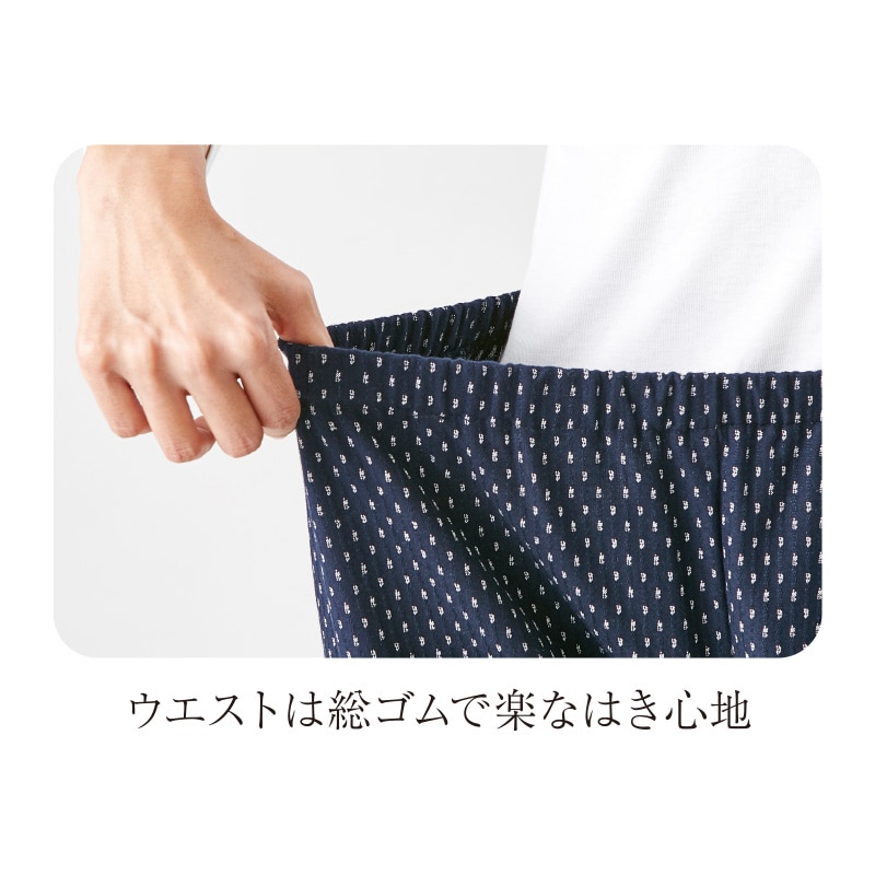 素材/綿100% 仕様/ウエスト総ゴム、右前ポケット付 日本製 *単位(cm) *カッコ内の数値は適応サイズ。洗濯機(ネット使用)