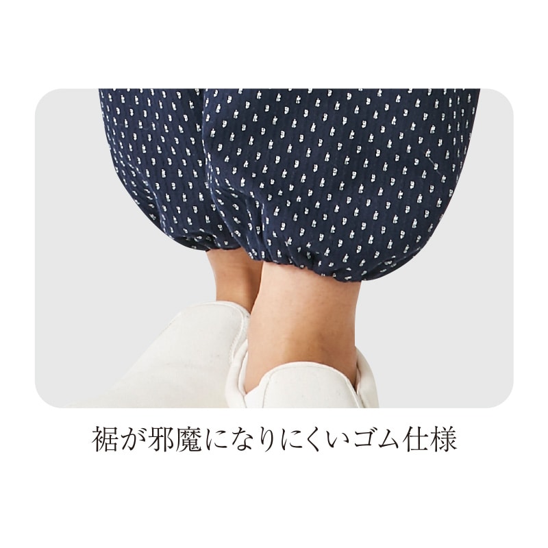 ウエストは総ゴムで楽なはき心地 小物が取り出しやすい前ポケット付き 裾が邪魔になりにくいゴム仕様