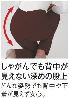 ぽっこりおなかにサイズを合わせると、ほかの部分まで大きくなってしまい、おまけに丈まで長くなってしまうんです。と、いう人におすすめのパンツ。太ももや股下はサイズアップせずに、ウエストと腰回りにだけ余裕を持たせました。だから苦しくなく、すべてがジャストサイズなので見た目もきれい!