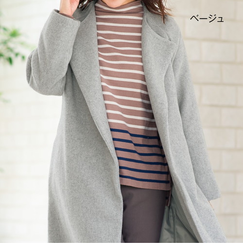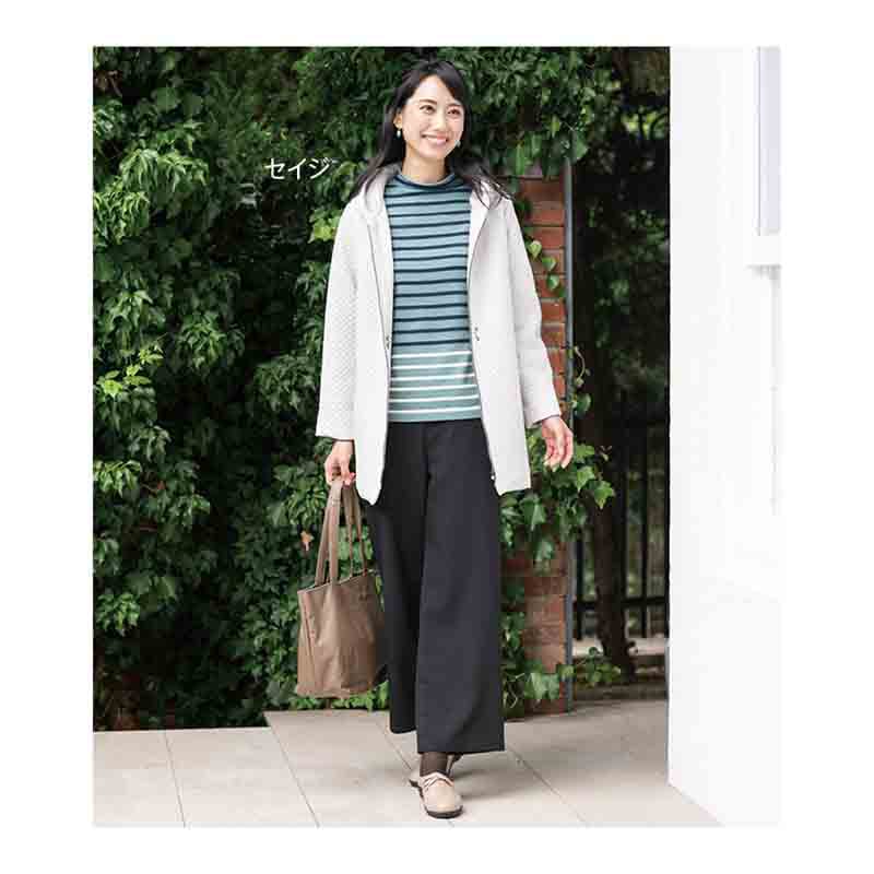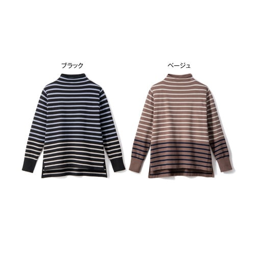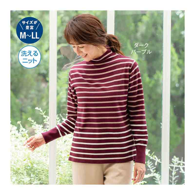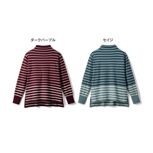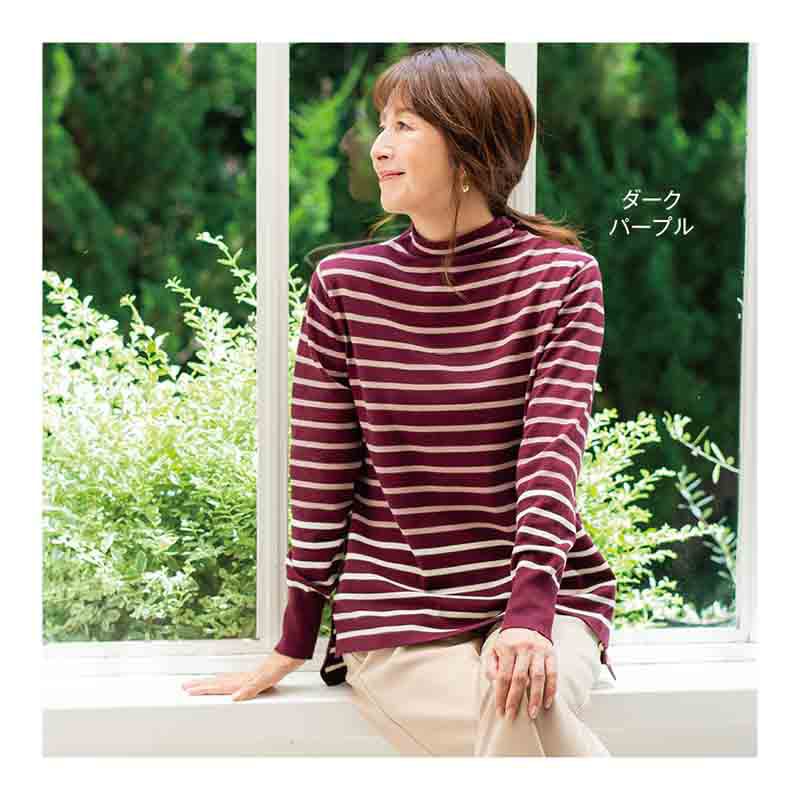 なめらかで肌を刺激せず、ボトルネックの衿元もストレスのない着心地。少し長めの後ろ身頃が、さり気なくおしりをカバーします。裾のラインの色を変えたら、新鮮で洗練された大人のボーダー柄が完成しました。