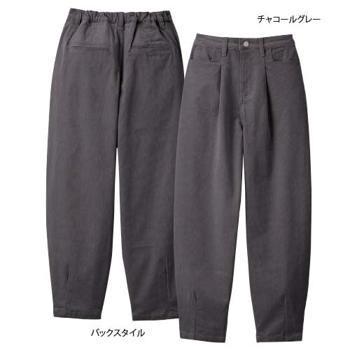 太ももまわりに余裕があり、裾に向かって細くなるフォルムが優しい印象。ゆるっとはいて体形をカバーできるカジュアルなパンツです。