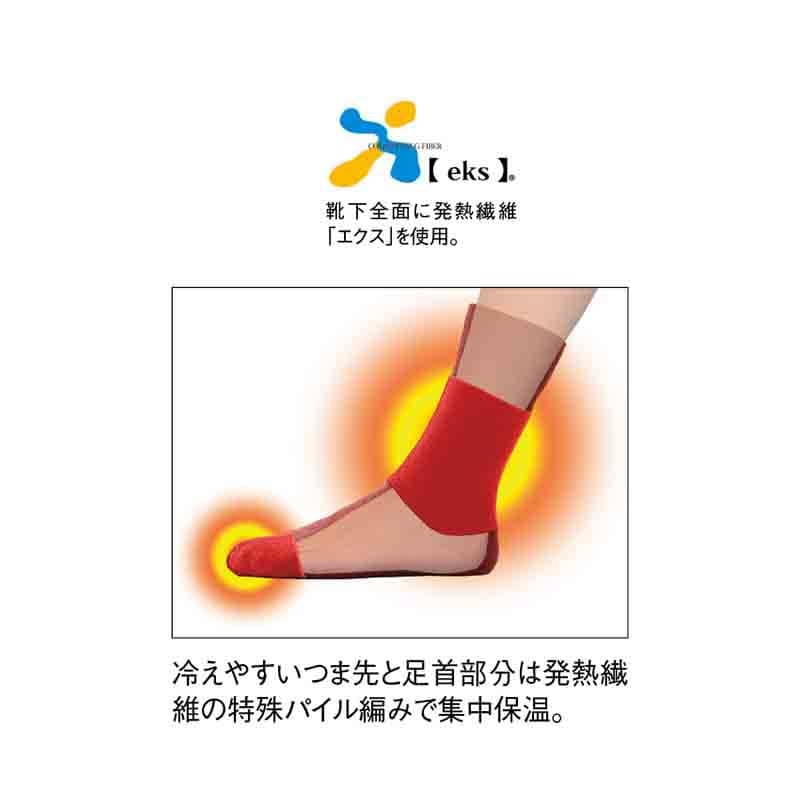 - 発熱繊維「エクス」を全面に使用し、冷えやすいつま先や足首部分は特殊パイル編みでぬくもり強化。それ以外の部分は薄手素材なので、靴を履くときにかさばりません。暖かさが長時間持続し、冷えを防ぎます。