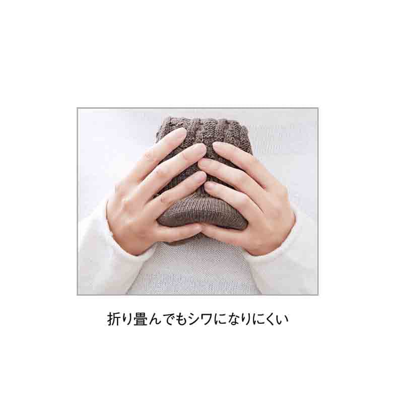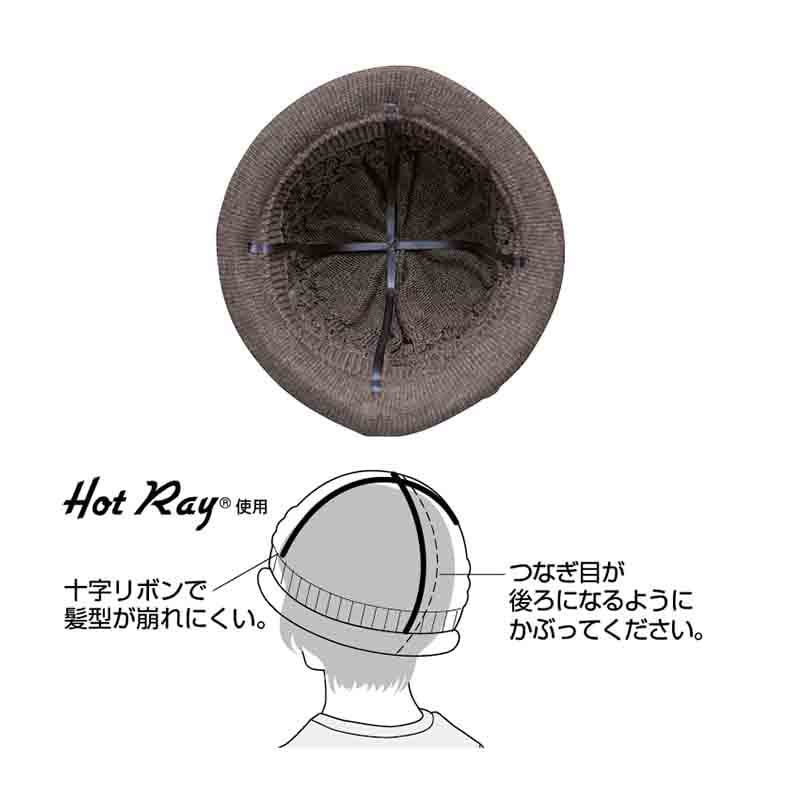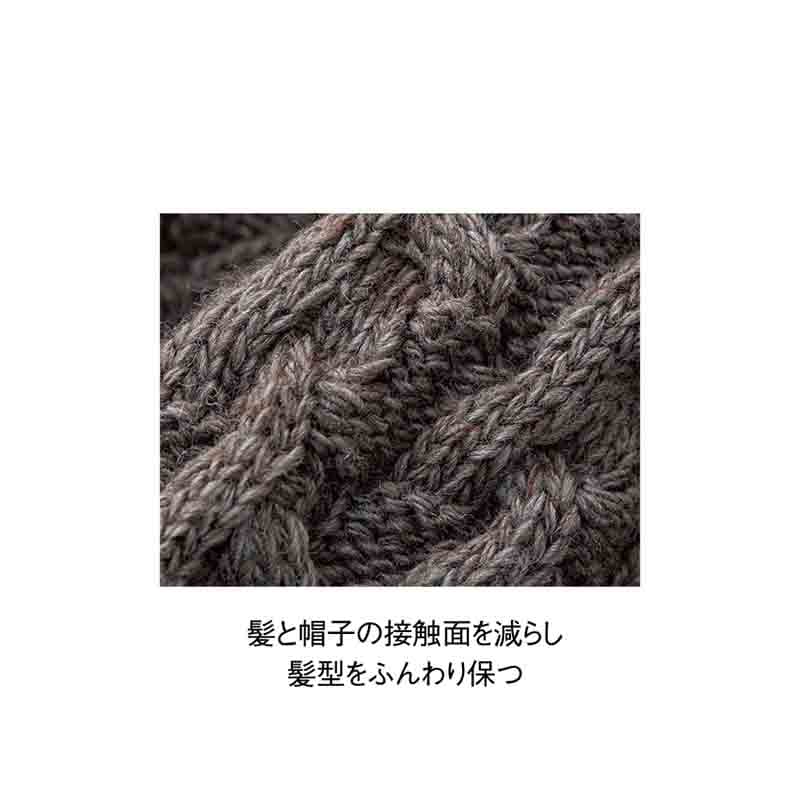 蓄熱糸を使用しているから寒い季節でもぬくぬくあったか。内側の十字リボンと立体的な編地で髪型のふんわり感をキープできます。