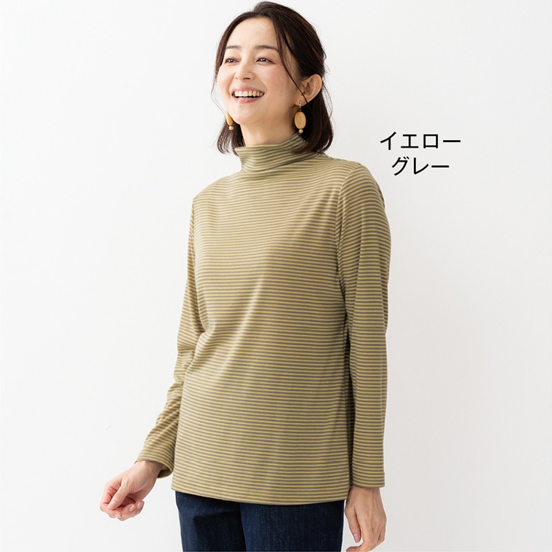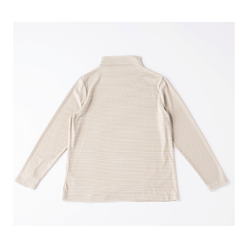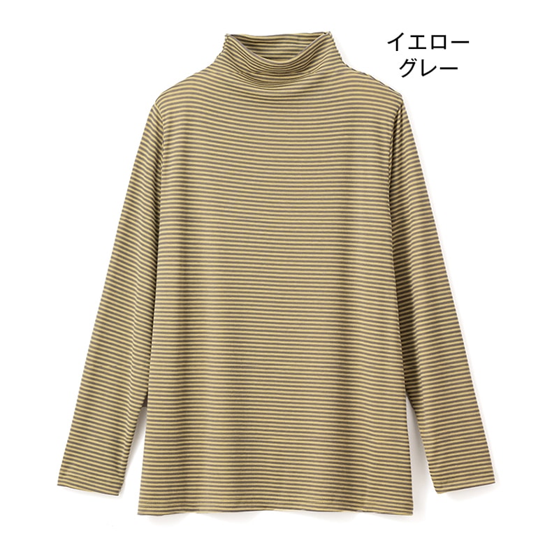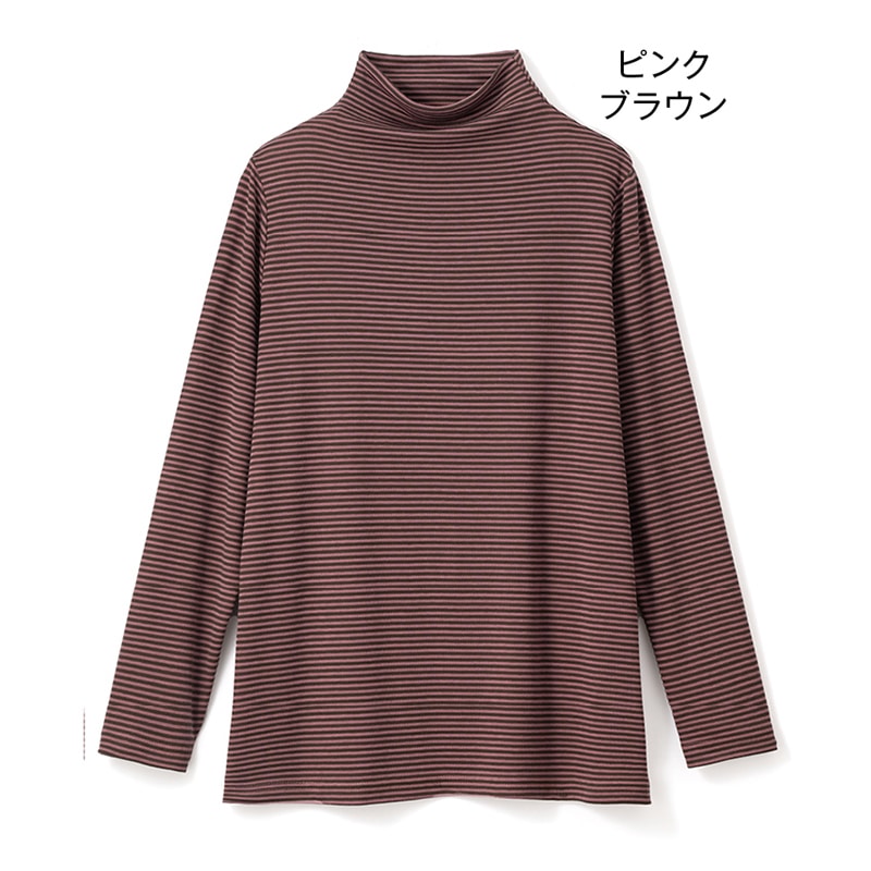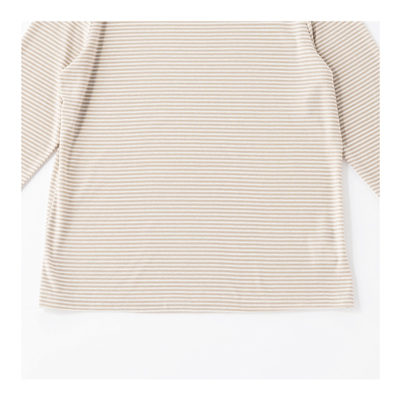 無地感覚でコーデでき、子供っぽくならない細ボーダー。ほんのり肉厚で1枚でも着やすい素材感です。柔らか素材が首元をカバー。