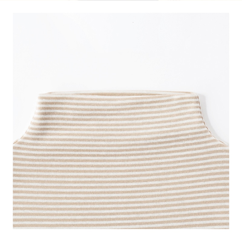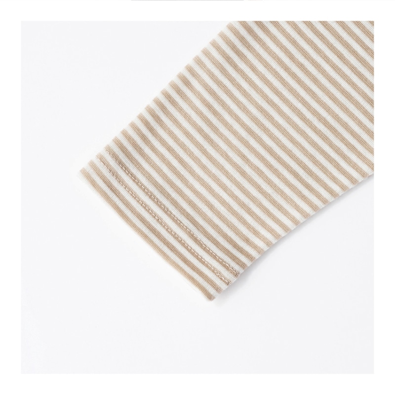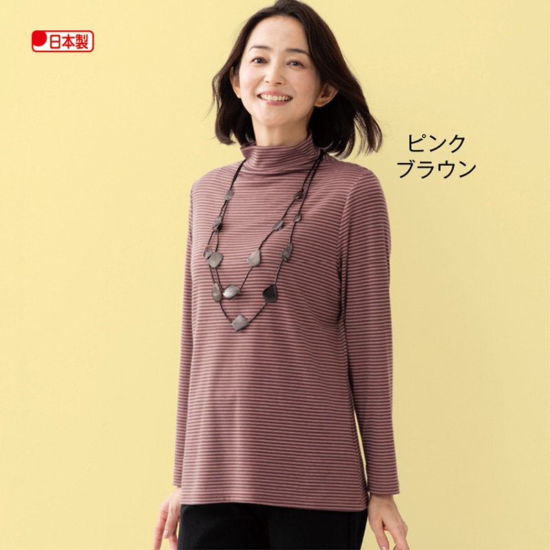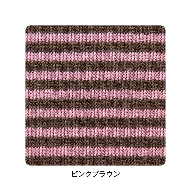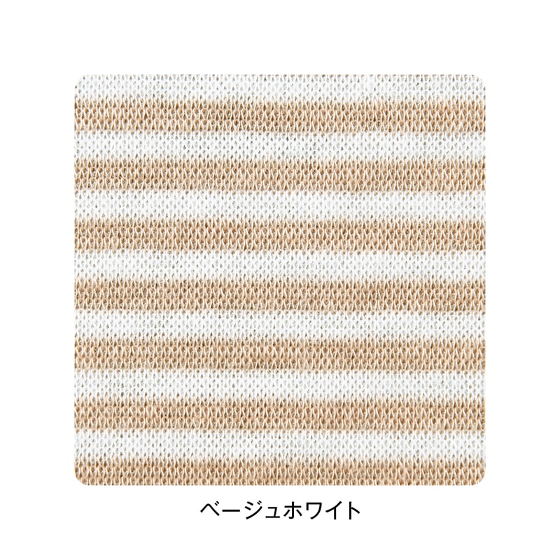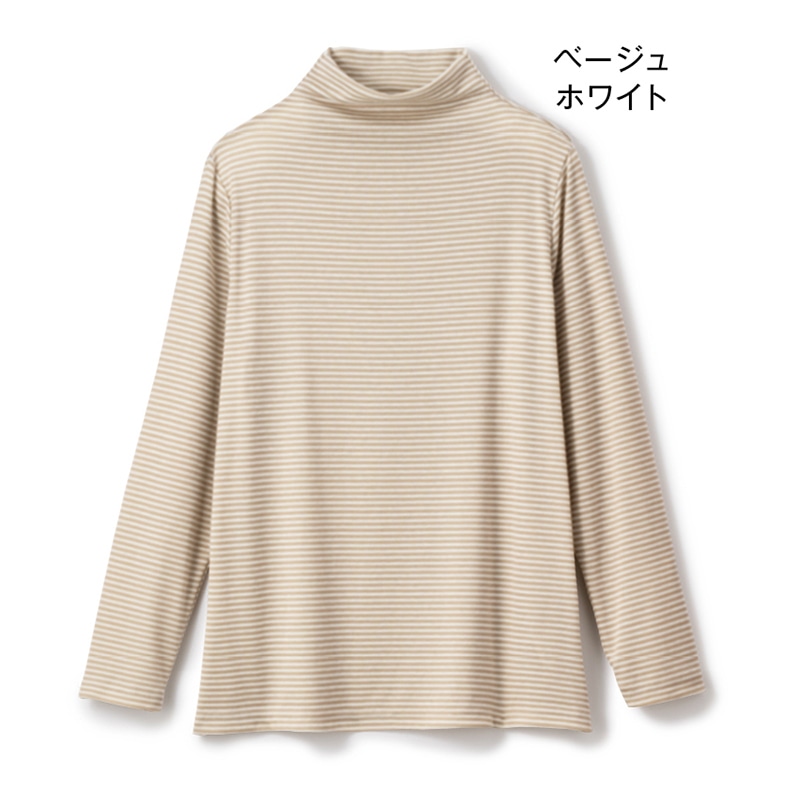 無地感覚でコーデでき、子供っぽくならない細ボーダー。ほんのり肉厚で1枚でも着やすい素材感です。柔らか素材が首元をカバー。
