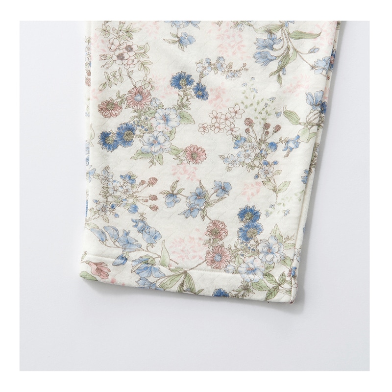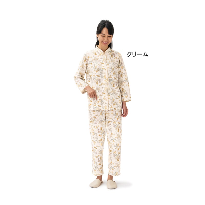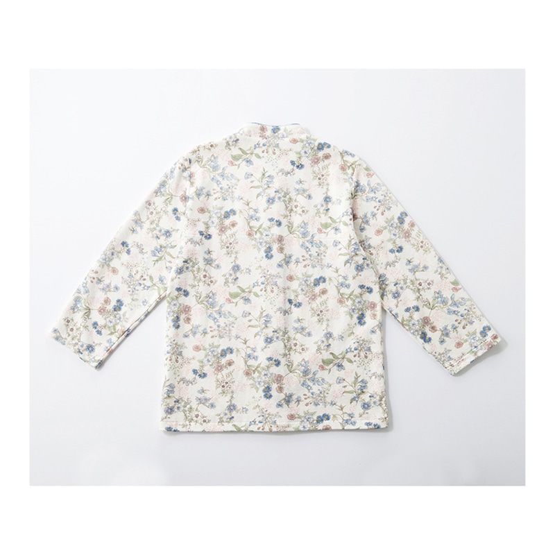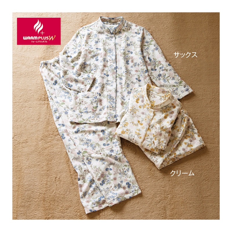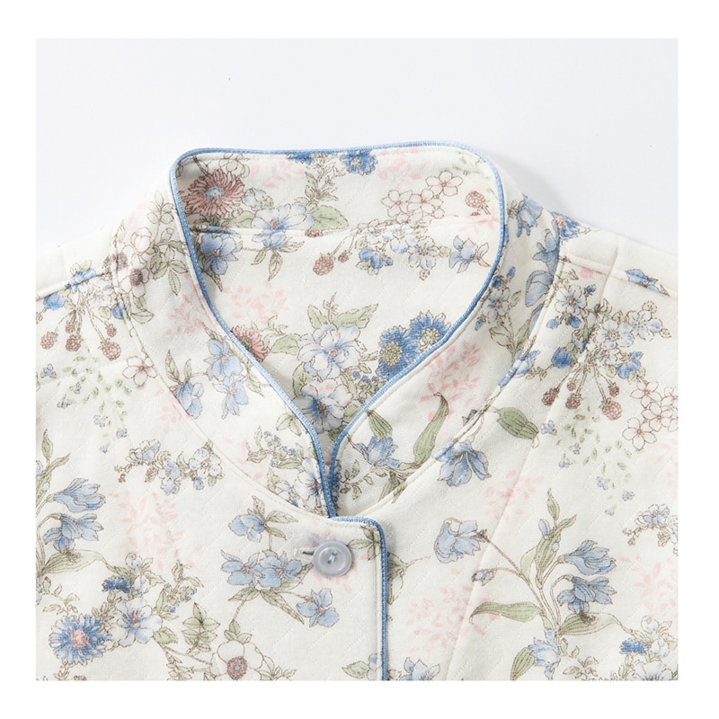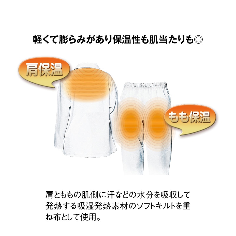 身生地は伸縮性のあるソフトキルト素材を使用し、さらに肩とももに吸湿発熱素材のソフトキルトの重ね布をプラス。保温性があり、柔らかで寝返りも打ちやすく、冬に最適のパジャマです。