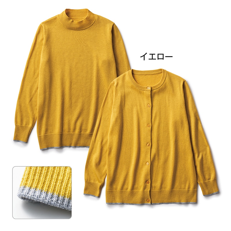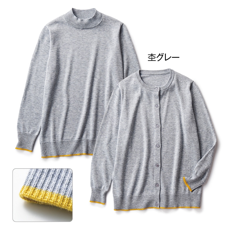 チラリと見える袖と裾の配色が魅力のハイネックニットとカーディガンのセット。単品でも使いまわせて便利なアイテム。お腹まわりのリブ部分もきつくならない様にサイズ感にもこだわって作りました。新色のライトグリーンも顔映りがよく綺麗なカラーです。