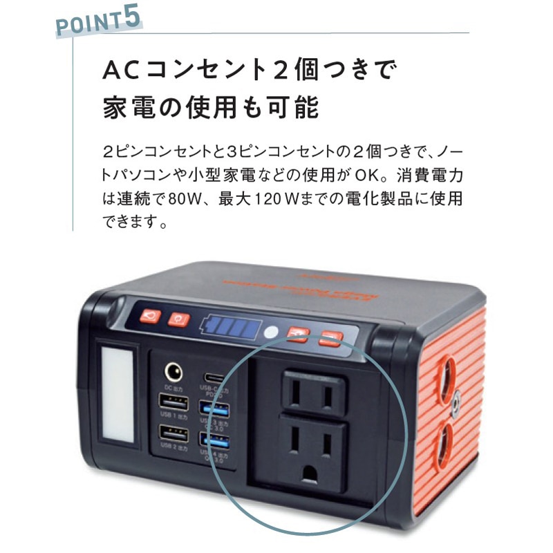 - コンセントのない場所で手軽に使えるポータブル電源。電気毛布などの家電のACコンセントをそのままさして使えるから、お花見でも活躍します。約1kgと軽量で小型ながらスマートフォンなら約8回の充電が可能という容量。キャンプの途中でスマートフォンの充電が切れて写真や動画を撮り逃すといったことが防止できます。本体には遠くを照らせる2灯式ライトとランタンの2種のLEDライト付き。しかも充電を使い切っても、太陽光で充電ができるソーラーパネルがセットになっているので、停電が長引いたときにも心強いです。