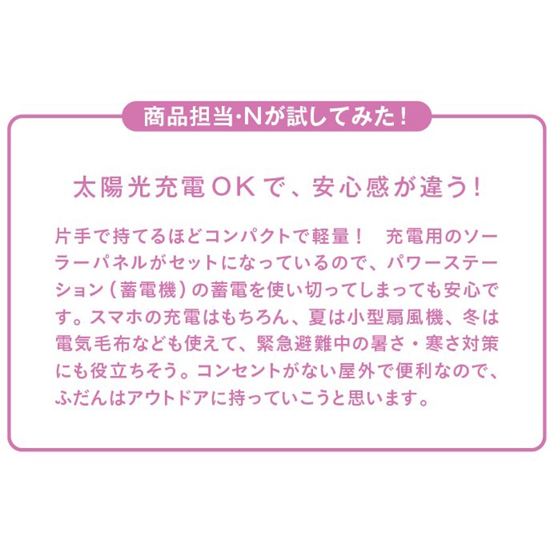 - セット内容/エバーブライト(R)メガパワーステーション、21Wソーラーパネルポケットつき サイズ(約)/本体:横14.4 ×縦7.7 ×奥行き10.5㎝ パネル:(開)80 × 29 × 2.5cm、(閉)29 × 19.5 × 3.5cm 重量(約)/本体:1.03㎏、パネル:900g 仕様/入力:DC19V/1.5A(AC アダプター)、DC15-24V/1.2A(ソーラーパネル) 満充電までの時間(約):付属のAC アダプターで5 時間 出力ポート:USB 2 個、USBQC3.0 2 個、USB-C 1 個、DC1 個、AC 2 個 電池種類・容量:リチウムイオン電池、24,000mAh(88.8Wh)、充電可能回数(約):500 回 本体付属品:AC アダプター、カーシガレットライターアダプター(出力用)、出力用USB ケーブル(USB プラグ-iPhone ライトニング/ マイクロUSB/ タイプC)、取扱説明書 パネル付属品:出力ケーブル(2m)、メガパワーステーション用プラグ、ノートPC 用プラグアダプター11個、カラビナ2 個、ストラップ(120㎝)、取扱説明書 保護機能/過充電保護、過放電保護、ショート(短絡)保護、過電流保護、過熱保護、過負荷保護、PSE 規格、RoHS 規格取得ずみ 中国製