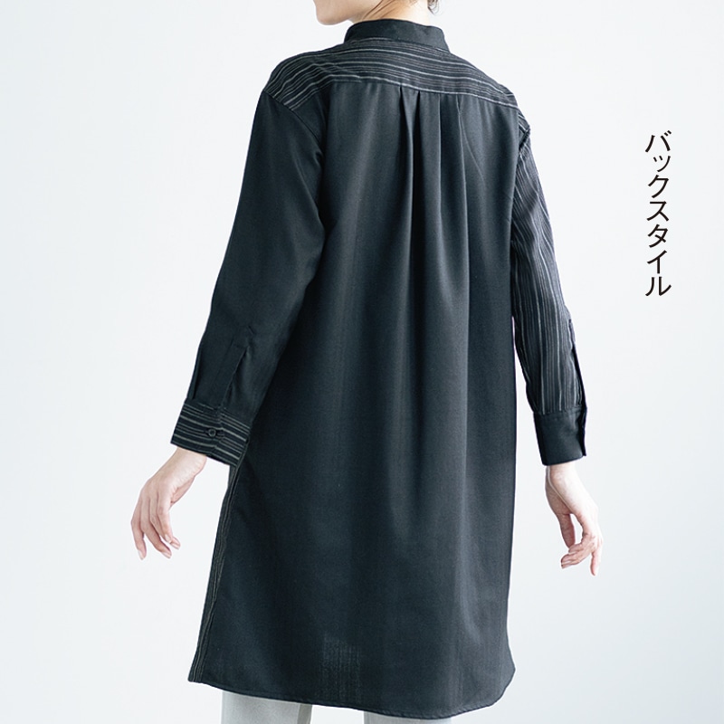 - 色/ブラック系 素材/無地部分:ポリエステル83%、レーヨン16%、ポリウレタン1% ストライプ部分:ポリエステル77%、レーヨン21%、ポリウレタン2% 仕様/前ボタン全開(14個)、袖口ボタン(各1個)、左右ポケット付き ※生産の都合により柄の出方が異なる場合があります。 ※アクセサリー、ボトムス、商品に含まれません。 中国製 手洗い