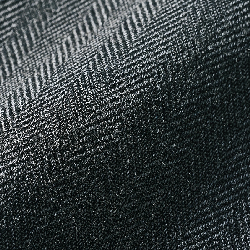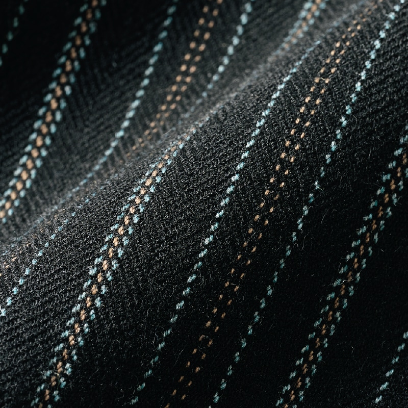 - 一見シックなのに凛と着映えるのはディテールの力。ストライプとヘリンボーン柄の切り替えや多ボタンデザイン、前をラウンドさせた裾ラインなど、すらりとスマートに、マニッシュな佇まいが決まります。
