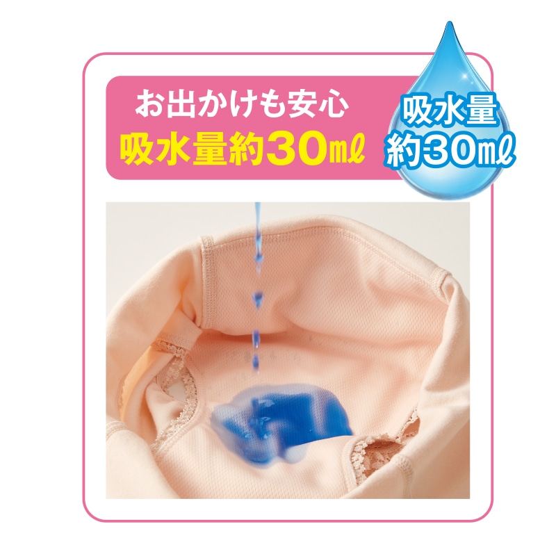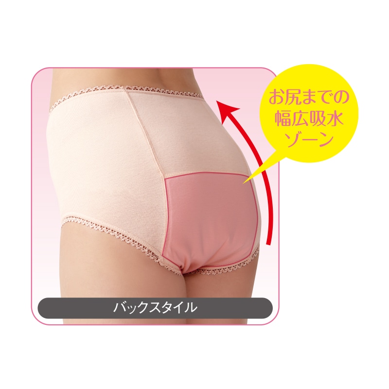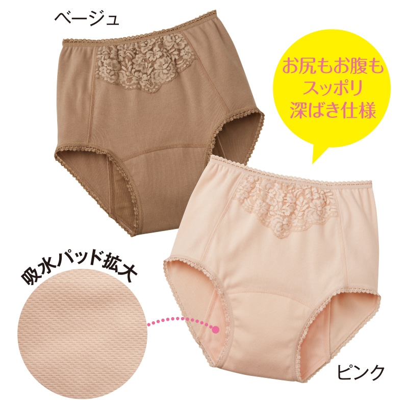 色/ベージュ・ピンクの各1枚 素材/身生地:綿100%、レース部分:ナイロン・ポリウレタン、ドライ層:ポリエステル100%、吸水層:綿100%、防水層:ポリエステル100%