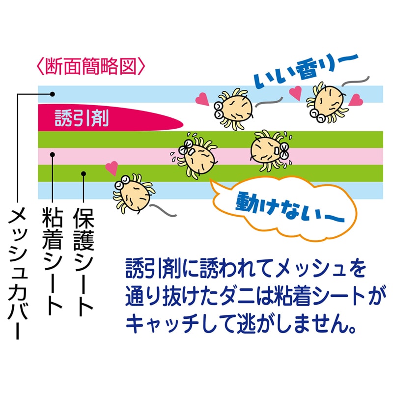 - 気になっているところに置いておくだけ。あとは誘引剤に誘われてメッシュを通り抜けたダニを粘着シートがキャッチ。