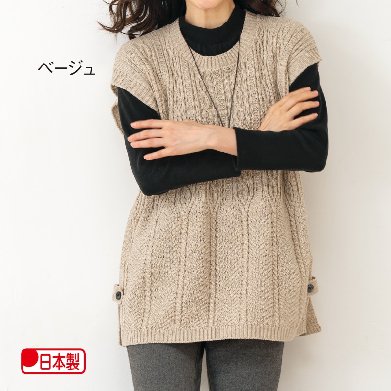 ゆったりと着られ肩先も暖かいニットベスト。変化のある編み地とサイドスリットのボタンがアクセント。