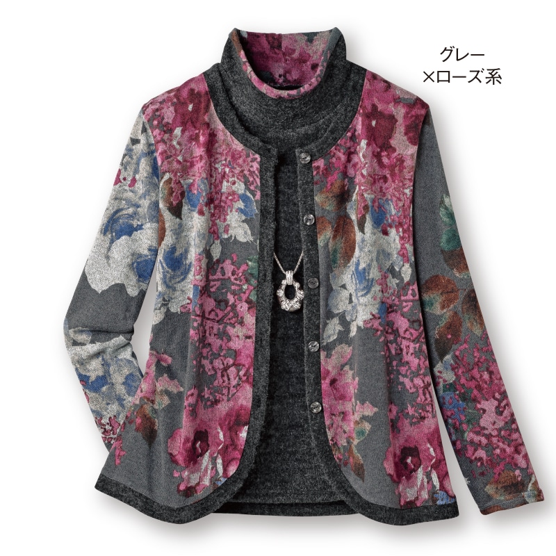 - セット内容/カーディガン、プルオーバー 色/グレー×ローズ系 素材/カーディガン:ポリエステル95%、ポリウレタン5% プルオーバー:ポリエステル85%、レーヨン10%、ポリウレタン5% 仕様/カーディガン:前ボタン全開(5個) プルオーバー:両脇スリット(約7cm) ※生産の都合により柄の出方が異なる場合があります。※カーディガンの後ろ身ごろは前身ごろと同柄です。※アクセサリー、ボトムスは商品に含まれません。 中国製 手洗いOK