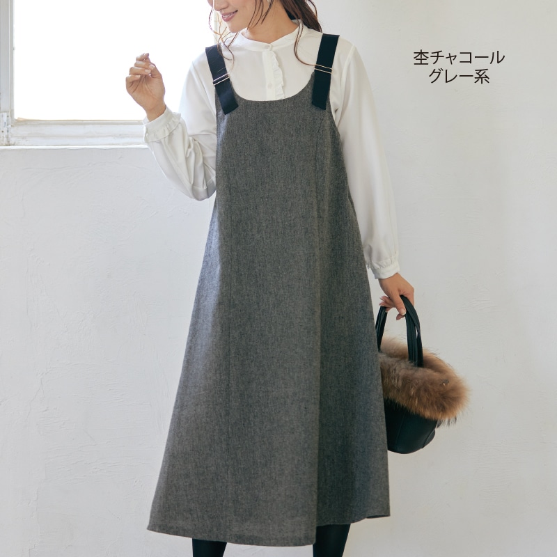 色/杢チャコールグレー系 素材/ポリエステル46%、アクリル35%,ナイロン9%、レーヨン5%、綿3%、毛2% 別布部分(肩ベルト):綿100% 裏地:ポリエステル100% 仕様/左脇ファスナー ※肩ベルトにて身丈調整可能です。 ※ツイード素材の特性上、ネップが入る場合があります。 中国製 手洗いOK