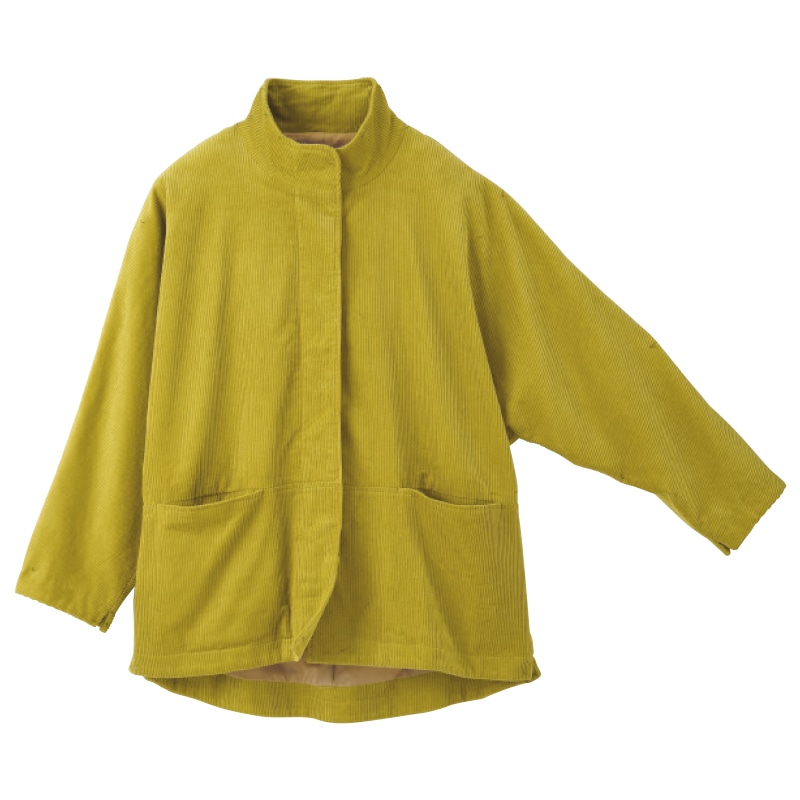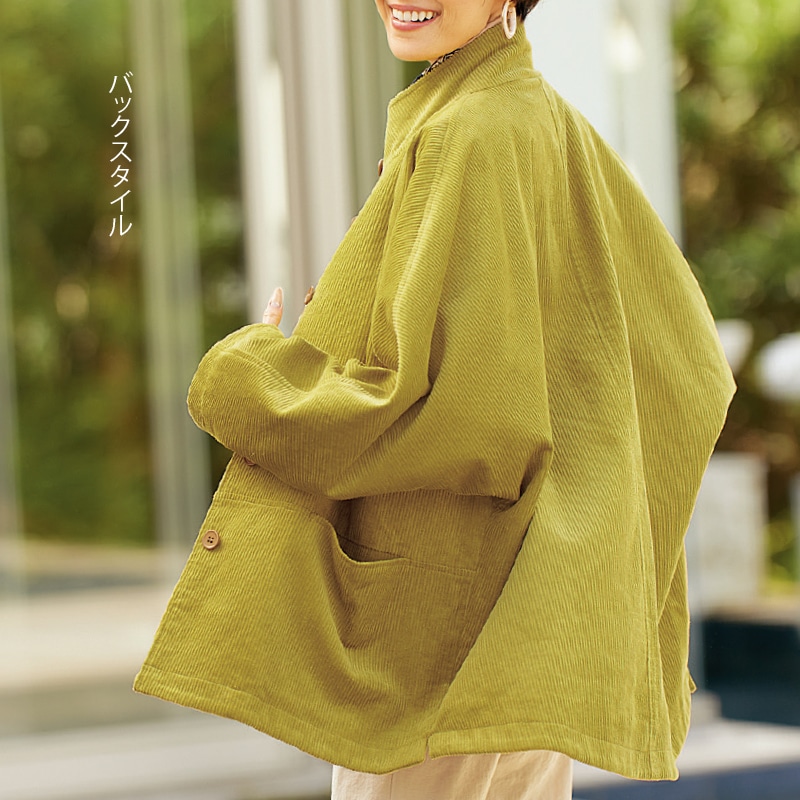 気軽に羽織れるコーデュロイ素材のショートコート。後ろが長いゆったりシルエットで、ボリューム袖トップスの上からもゆったり着られます。
