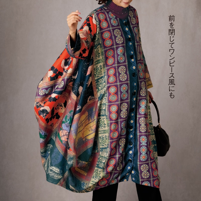 鮮やかな和柄のコートはアートのような存在感。お洒落なコクーンシルエットでワンピース風に着ても素敵。