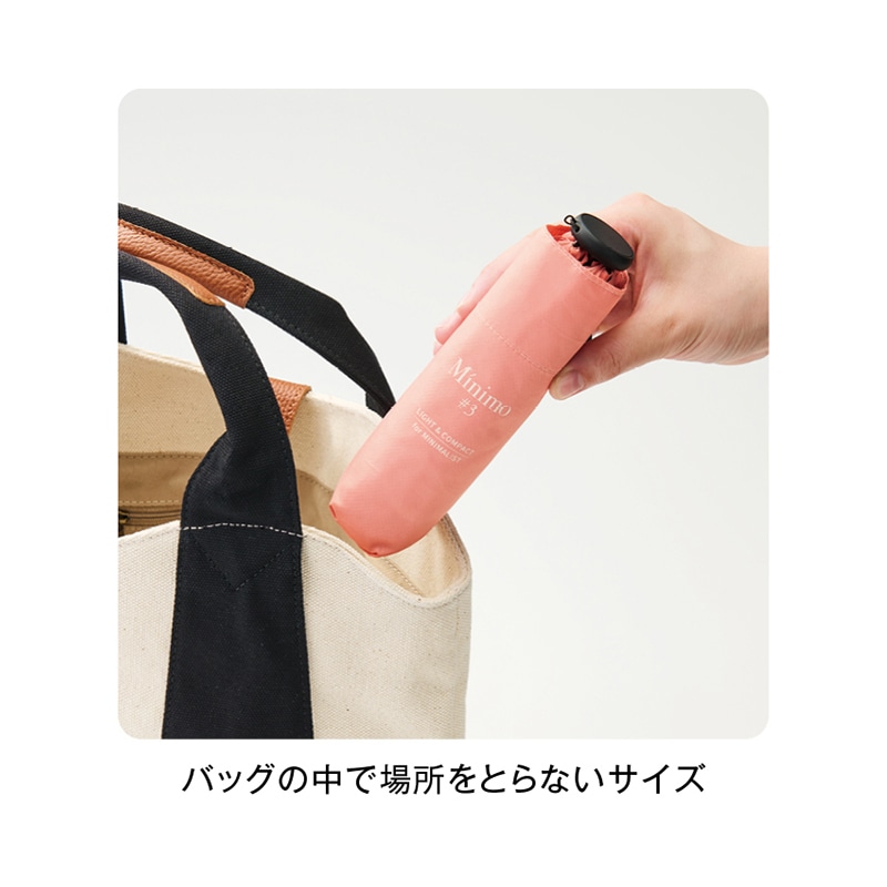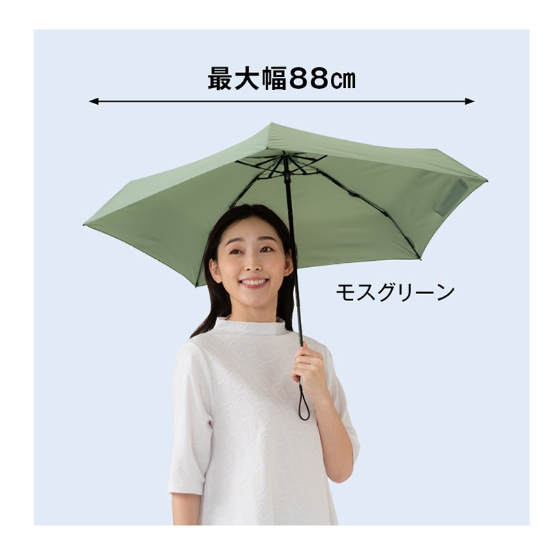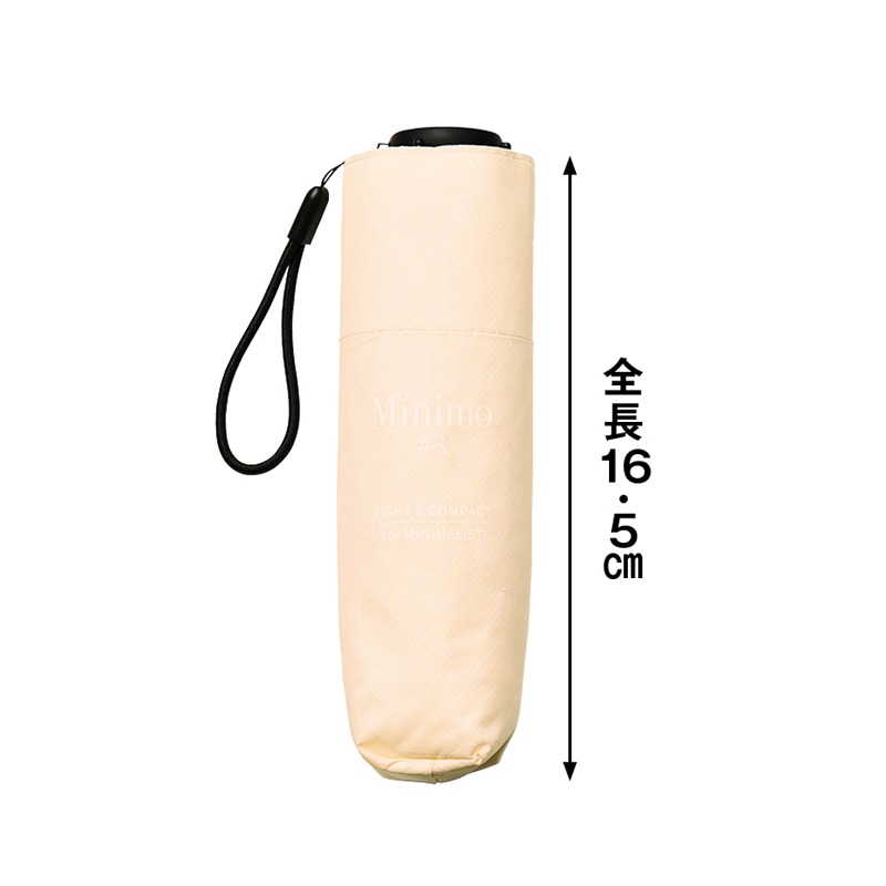 たたむと長さが約16.5cm。文庫本とほぼ同じ大きさになる晴雨兼用の折りたたみ傘。親骨には軽くて強度の高いカーボンファイバーを使用しています。携帯用として毎日持ち歩くのに最適です。