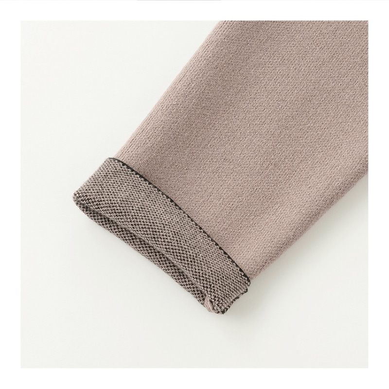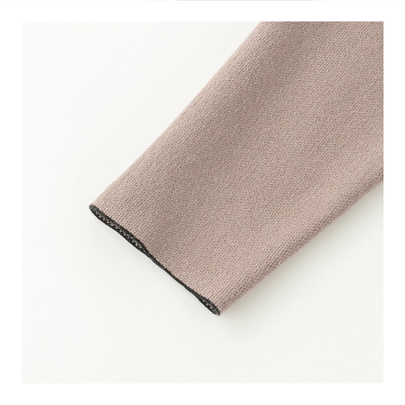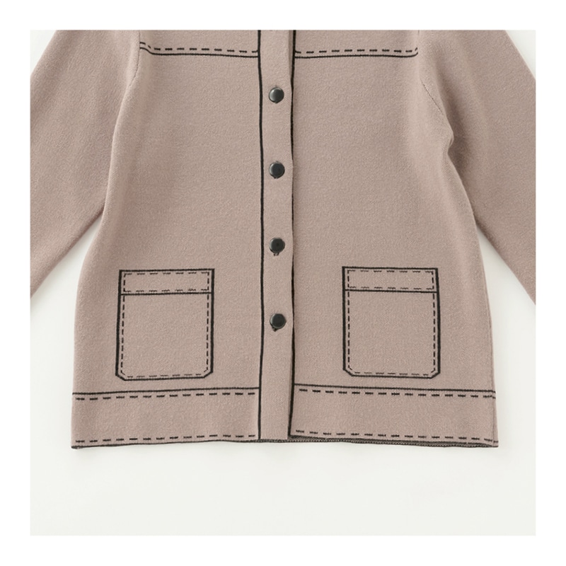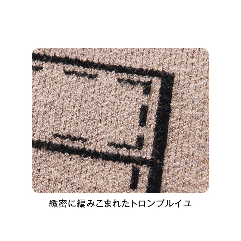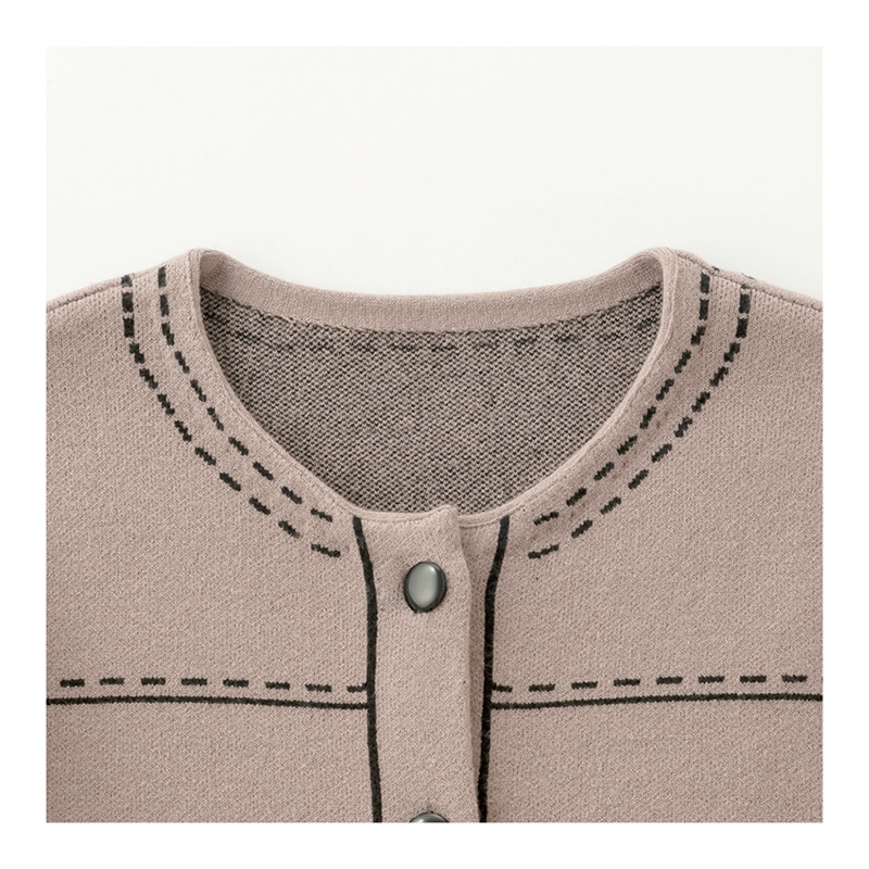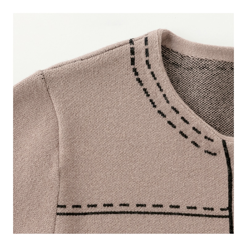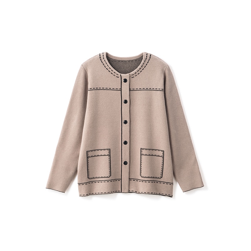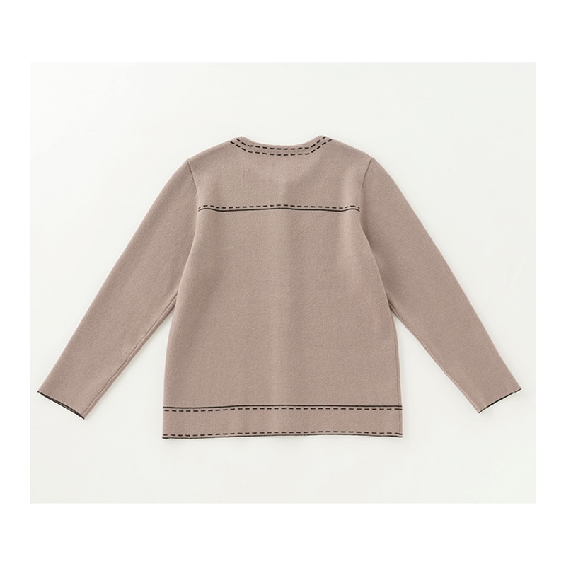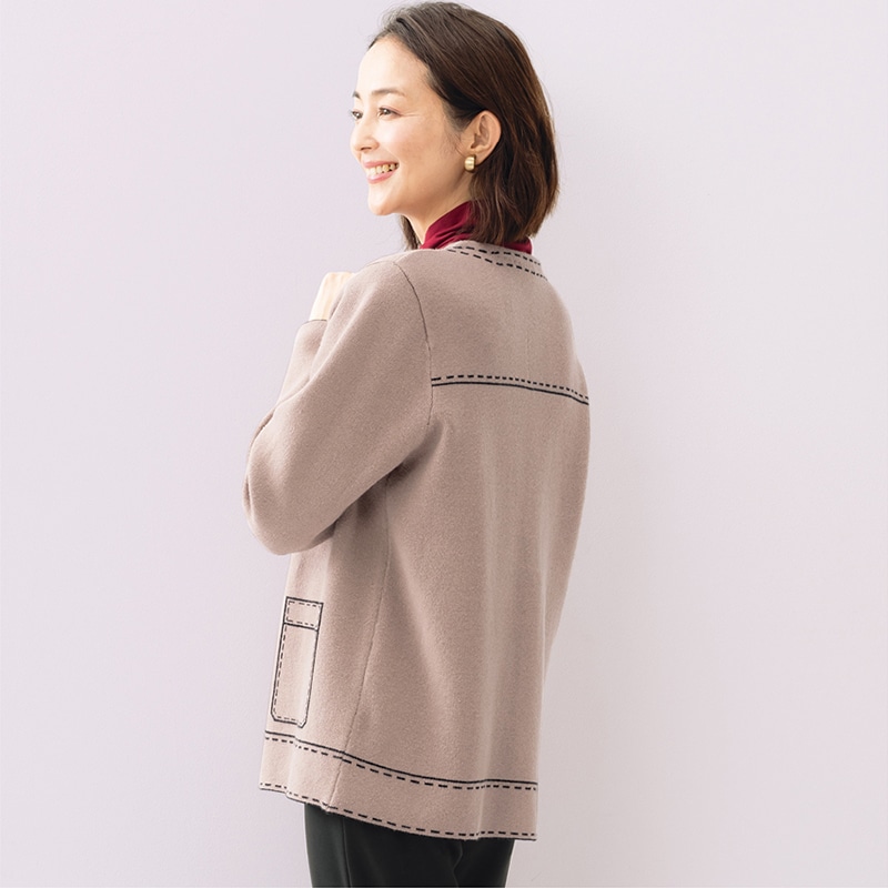 - どんなインナーとも合わせやすく使い勝手のいいノーカラー。ステッチはプリントではなく編んだトロンプルイユ(だまし絵)。袖ぐりもおなか回りもゆったり、心地よく重ね着できるシルエットです。
