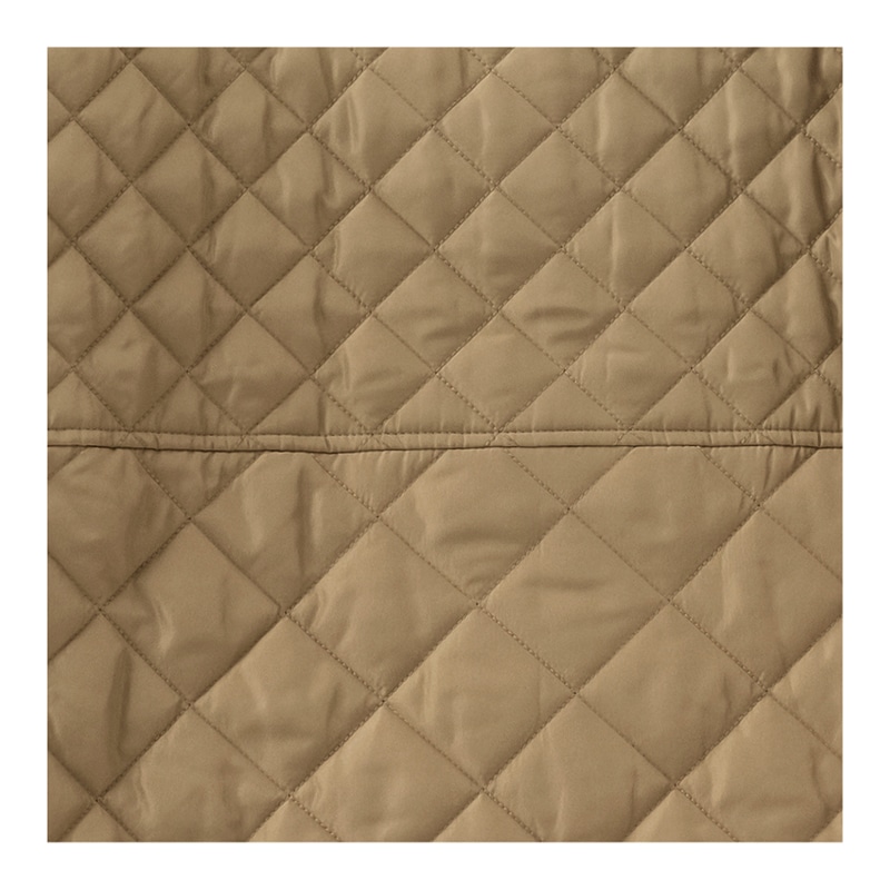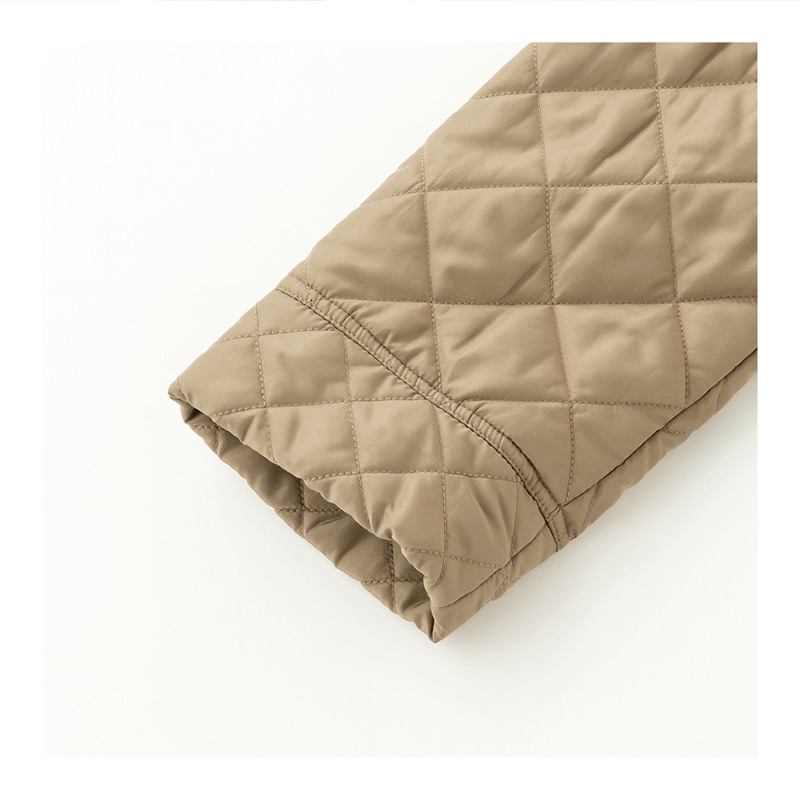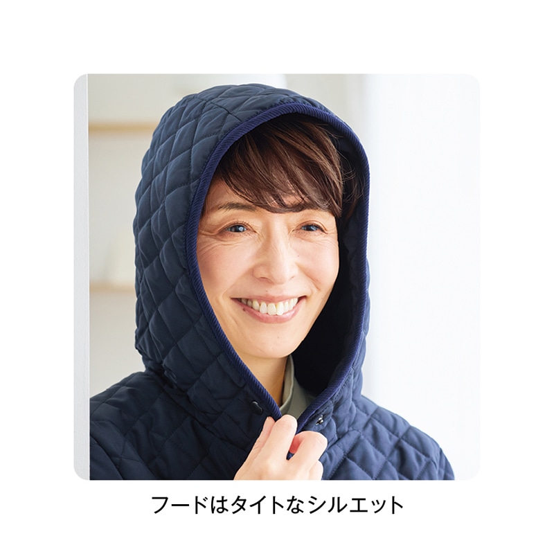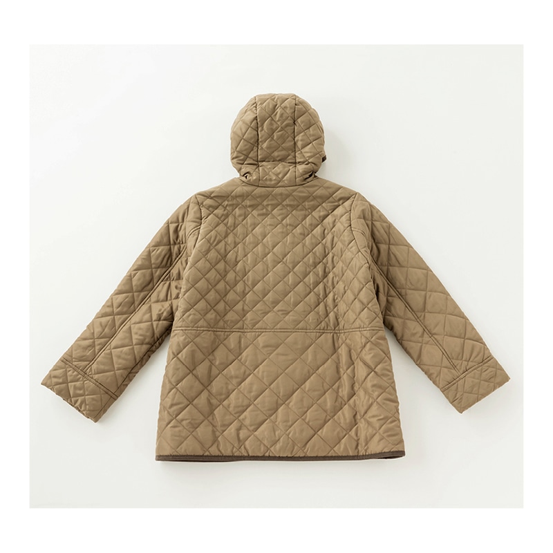 中綿入りで暖かく、着ると手放せなくなるキルティングジャケット。ウエストから上は小さなダイヤ形、下は大きなダイヤ形で、体形をすっきり品よく見せます。