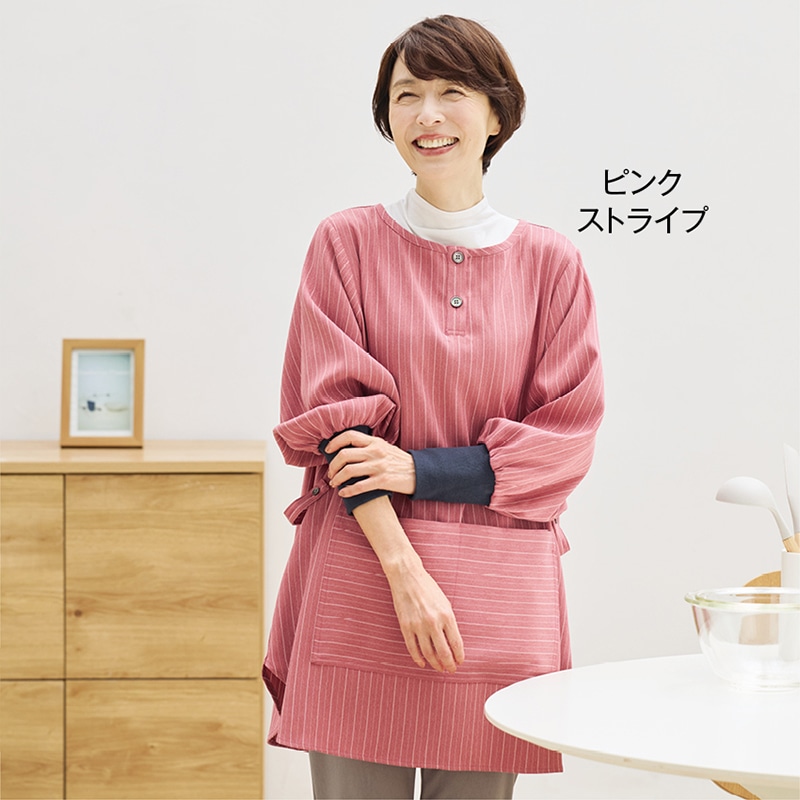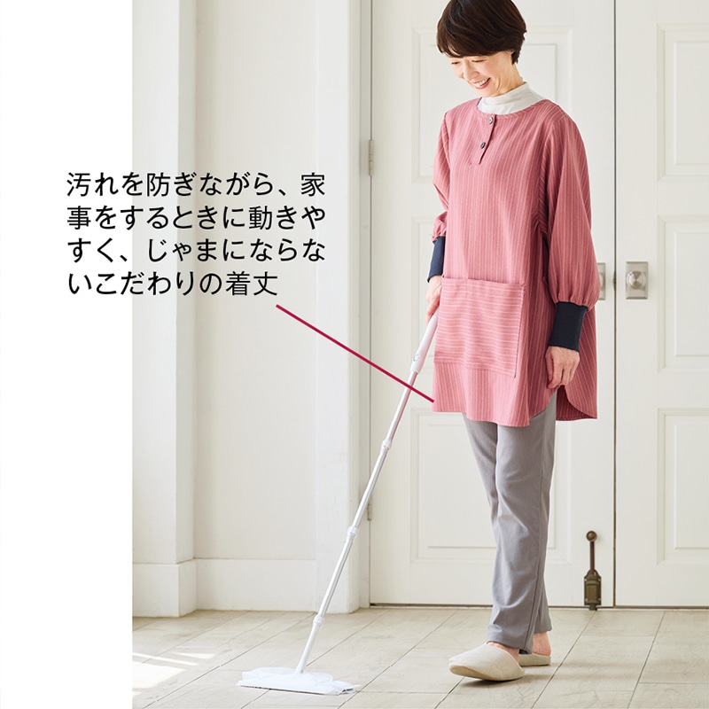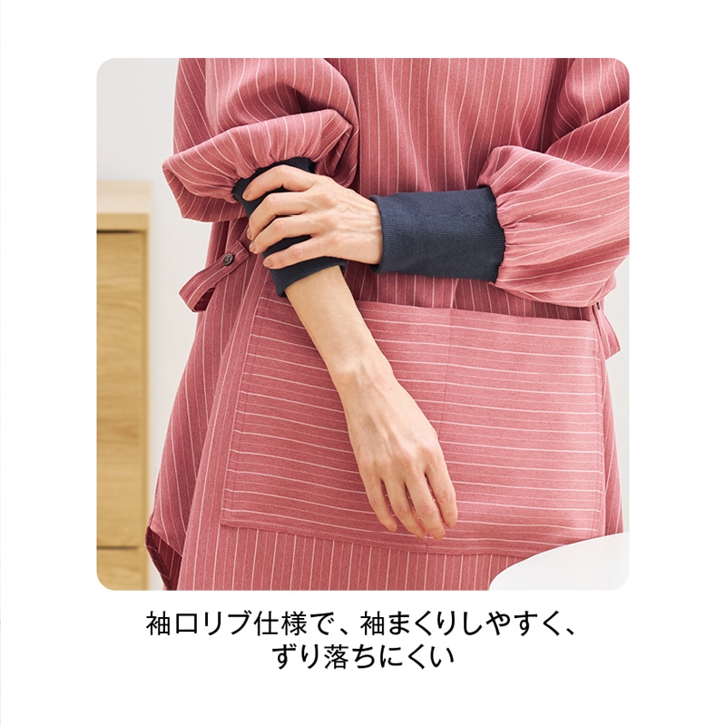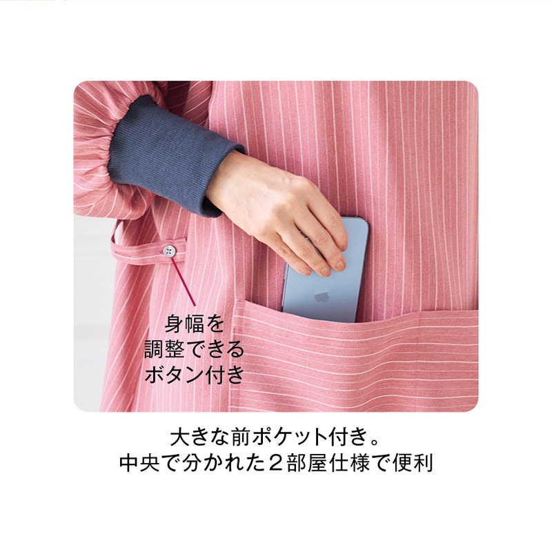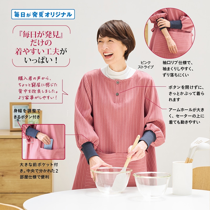 - 「水仕事のときに袖がじゃま」というお客さまの声に応えた「毎日が発見」オリジナルかっぽう着。袖まくりしやすく、ずり落ちにくい工夫を凝らした袖口がポイントです。2室に分かれた大きめのポケットや、動きやすい着丈にもこだわりました。
