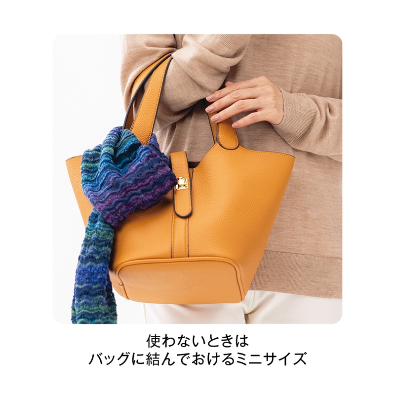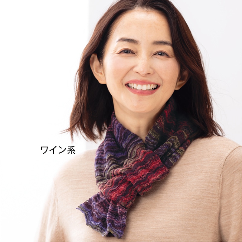 編み模様がかわいいミニマフラー。首に回して通し口に端を差し込むだけできれいな形が完成。ミニだから室内でも使えて、携帯にも便利です。