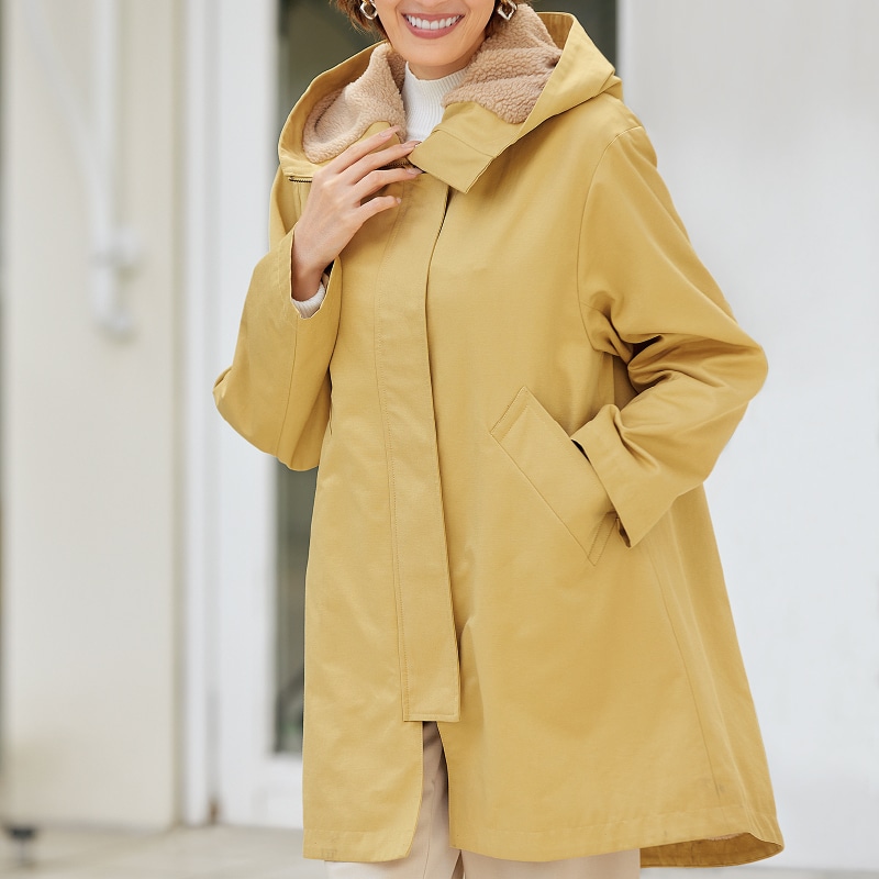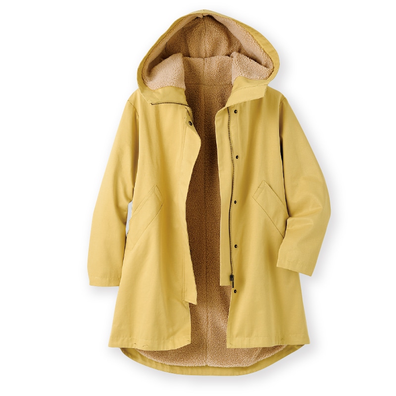 色/マスタード×ベージュ 素材/綿55%、ポリエステル38%、ナイロン7% ボア部分(フード裏・後ろ身ごろ裏):ポリエステル100% 仕様/ポケット付き、裏地付き(前身頃・袖部分のみ)※アクセサリー、インナー、ボトムスは商品に含まれません。中国製 ドライ