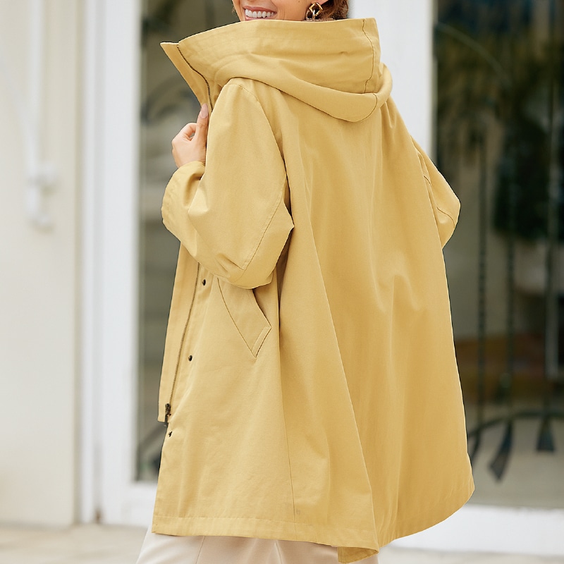後ろ身頃からフードにかけて施した裏ボアのぬくもりが、寒さの残る時期でも暖か。表面感はフラットな生地で、前身ごろと袖の裏地は布仕様だから動きやすくて軽やかです。