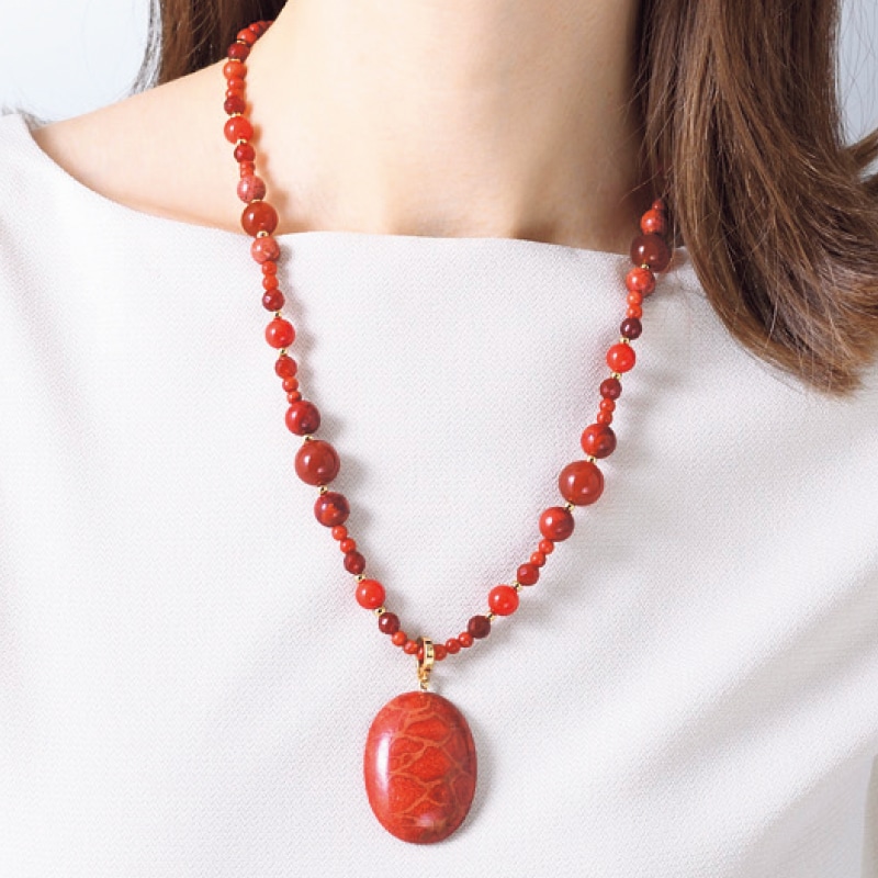 人気のイソバナ珊瑚を中心に赤系のカラーストーンでまとめた華やかなネックレス