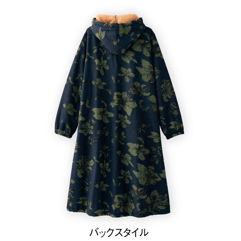 しっかり暖かな裏ボア素材やロング丈。シックな花柄もおしゃれなコートは、裾の紐を絞ってコクーンシルエットも楽しめます