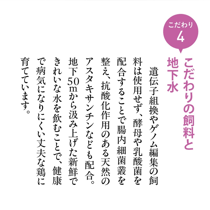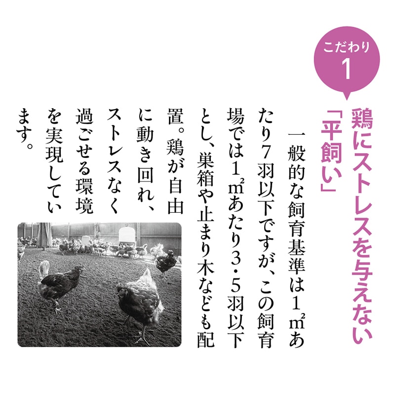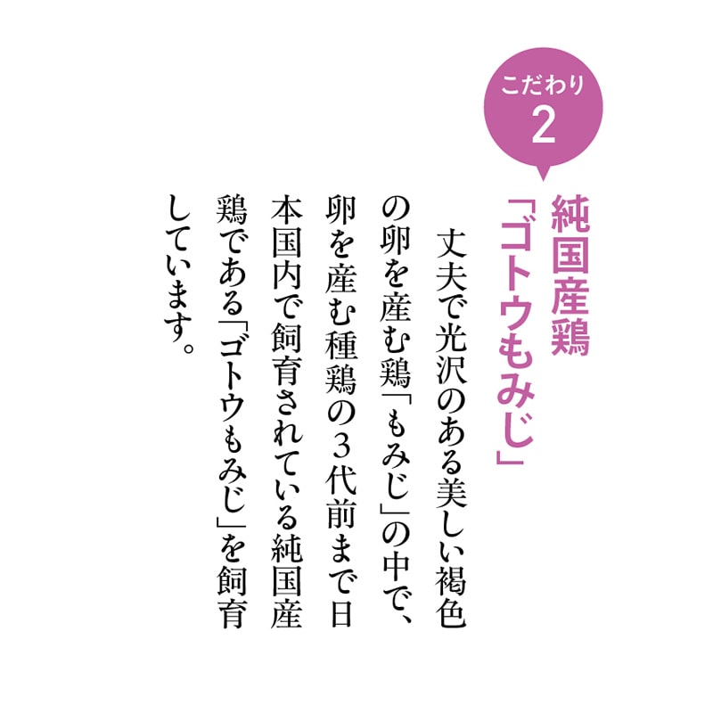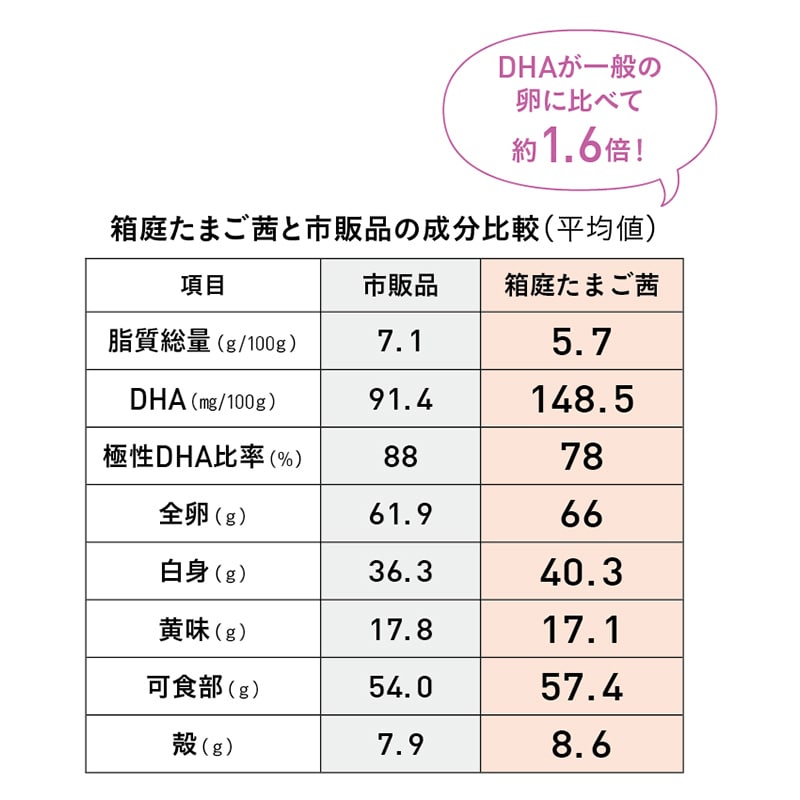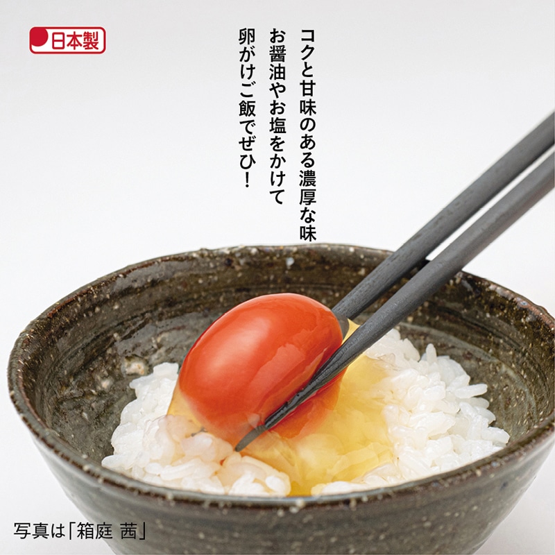 - 鮮やかな茜色をした大きく弾力のある黄身はお箸でつまめるほど。旨味成分であるアミノ酸を多く含み、濃厚でもっちりした味わいなので、たまごかけご飯がおすすめ。健康や美容によいといわれるDHAも多く含み、高い栄養価が特徴です。