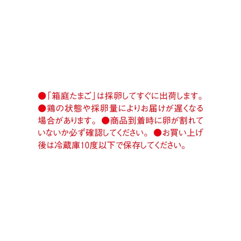 ●「箱庭たまご」は採卵してすぐに出荷します。●鶏の状態や採卵量によりお届けが遅くなる場合があります。●商品到着時に卵が割れていないか必ず確認してください。●お買い上げ後は冷蔵庫10度以下で保存してください。お客様都合の返品・交換はできません。