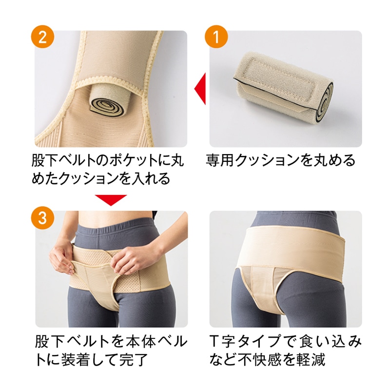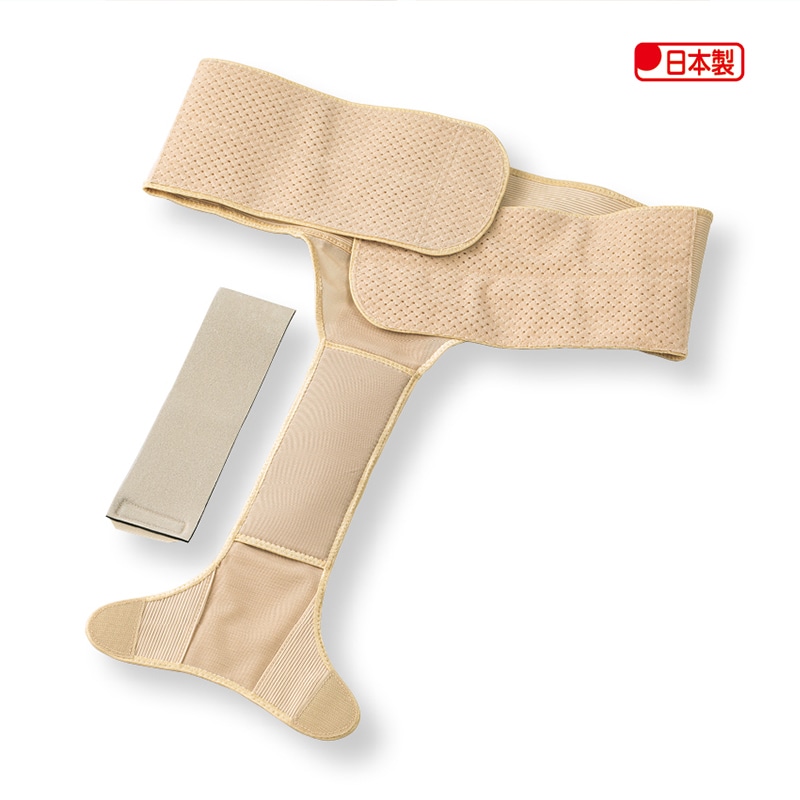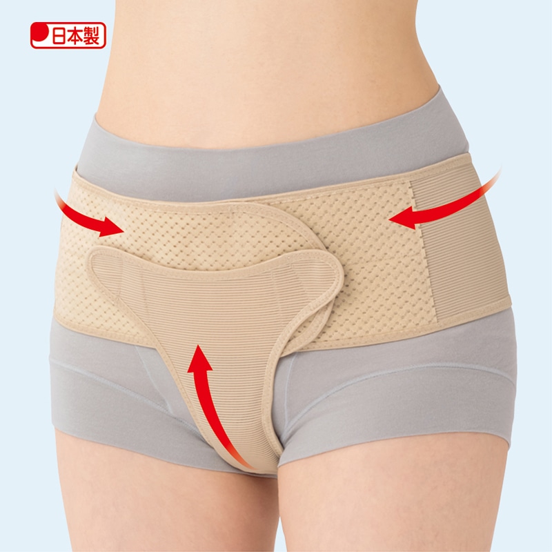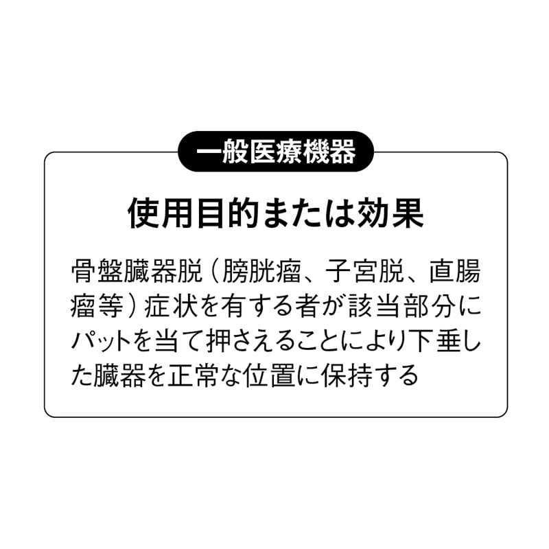 子宮や膀胱、大腸など骨盤内にある臓器が膣から下垂する骨盤臓器脱は、下垂に伴う違和感や歩きにくさなど日常に影響を及ぼします。本品は骨盤を締めながら股からベルトを通して膣部分にパットを当てて押さえ、骨盤臓器脱をくい止める医療機器です。
