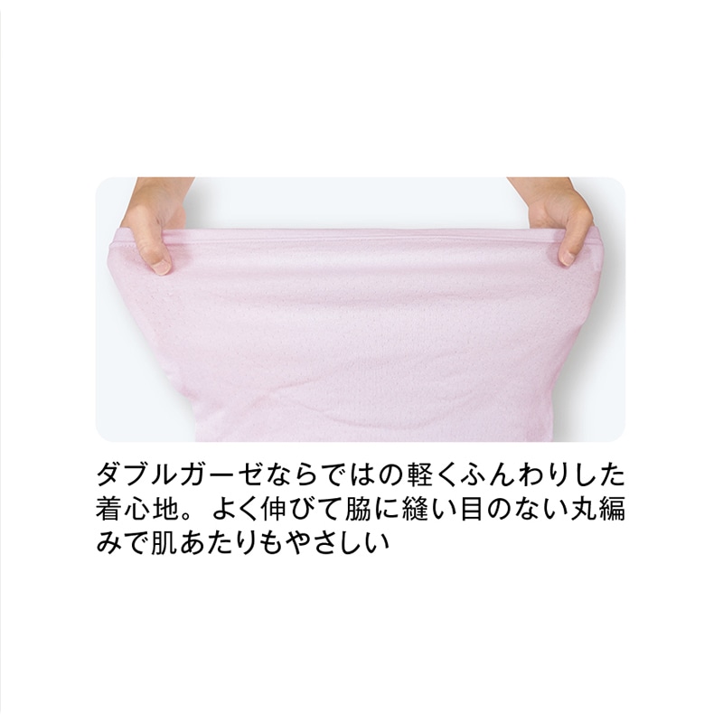 - 昼間は暖かく朝晩は肌寒い。体温調節が難しい今の時期におすすめの綿100%ダブルガーゼの肌着です。適度な保温性があり、ふわふわの肌触りは一度着ればやみつきに。敏感肌や年齢肌にもチクチクしないやさしい感触で、袖口からチラ見えしにくい8分袖も◎。