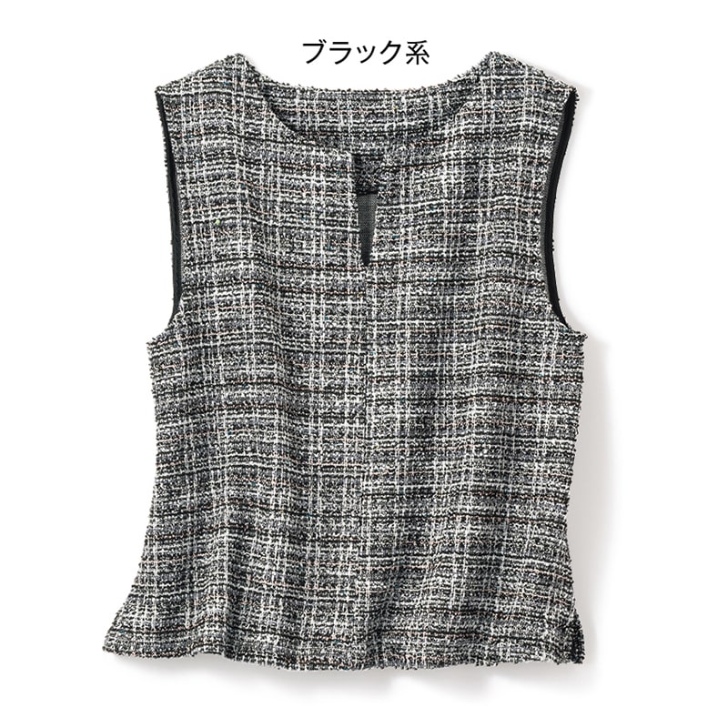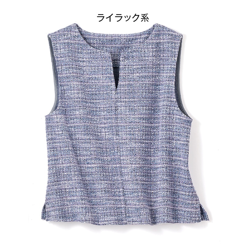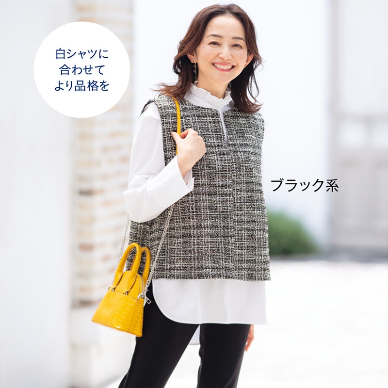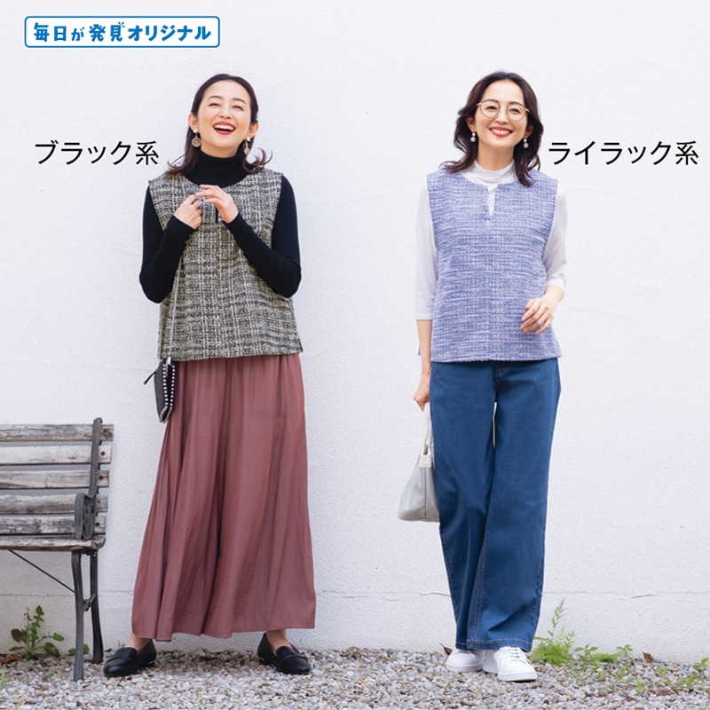 軽くて伸びのよいニットベスト。首元にスリットが入り、中にどんなインナーを合わせても圧迫感なく着られるのが嬉しいポイント。体の中心はしっかり温めつつ、動きやすいベストは、秋から冬に大活躍。