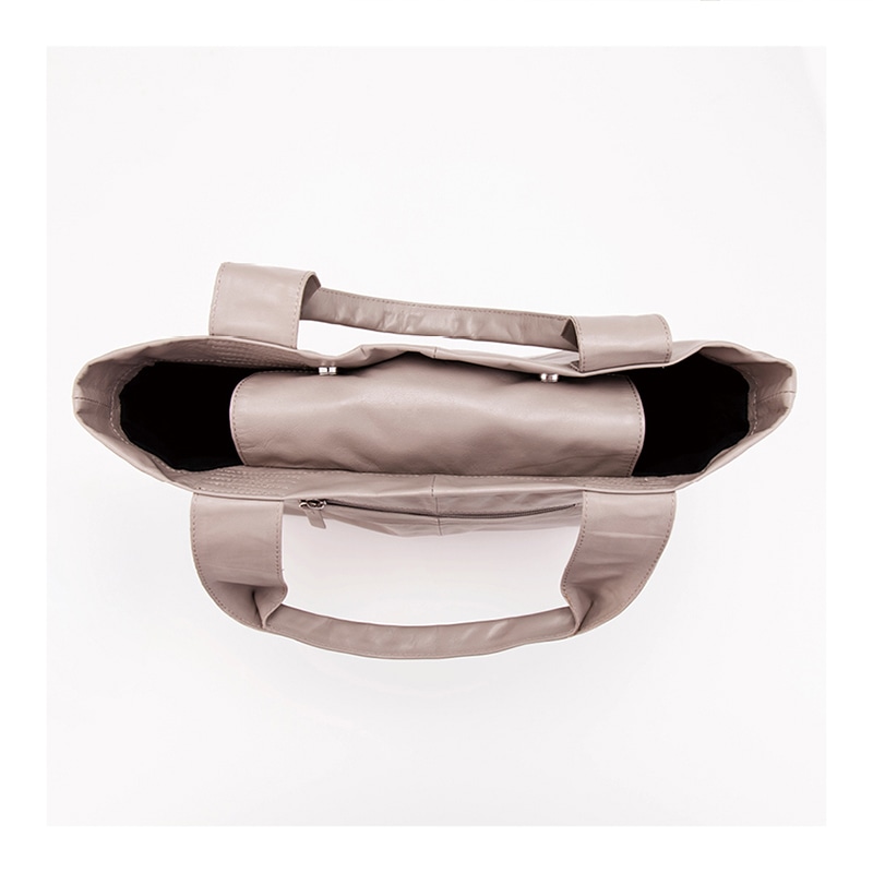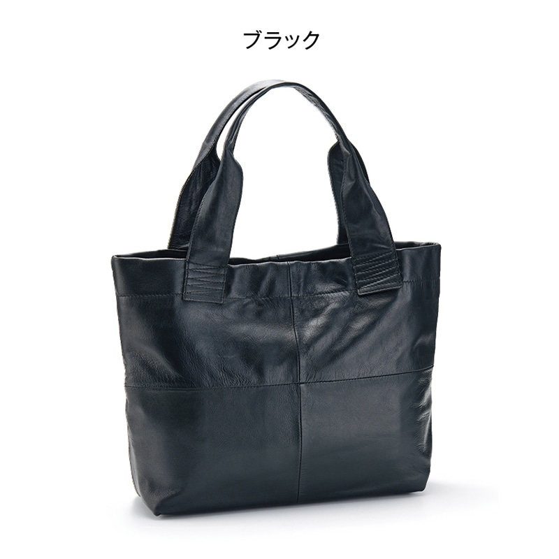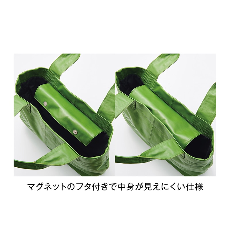 素材/山羊革 裏地:ポリエステル 仕様/マグホック式開閉、内部:オープンポケット×2、ファスナーポケット×1、外部ファスナーポケット×1 重量(約)/320g サイズ(約)/縦28.5×横上部41・横下部30×マチ10cm 持ち手立ち上がり20cm バングラデシュ製