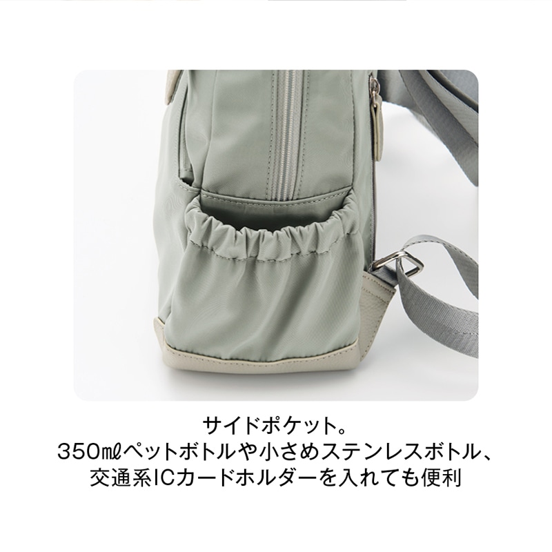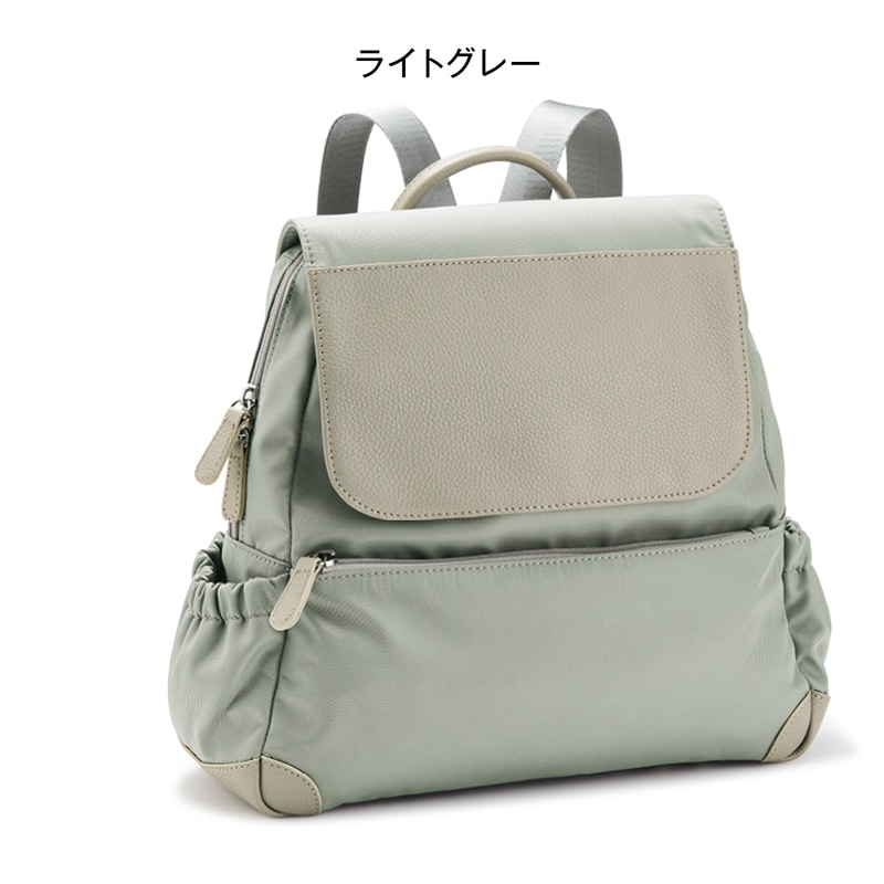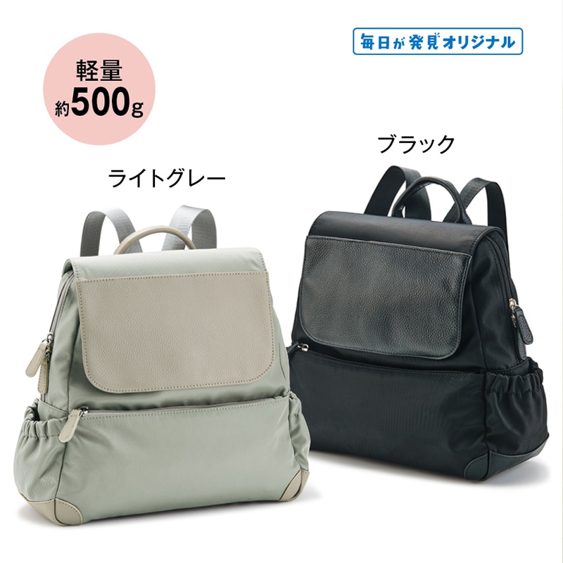- 旅でも日常でもバッグは軽いのがイチバン。でも見た目のきれいさは必須。というわけで完成したオリジナルリュックです。メイン素材はナイロンですが、ふたやバッグ下部の角など耐久性が必要な箇所は牛革を使用し、オールレザーのリュックより格段の軽さを実現。大人女性が持ちやすく使いやすい上品スタイルに仕上げました。