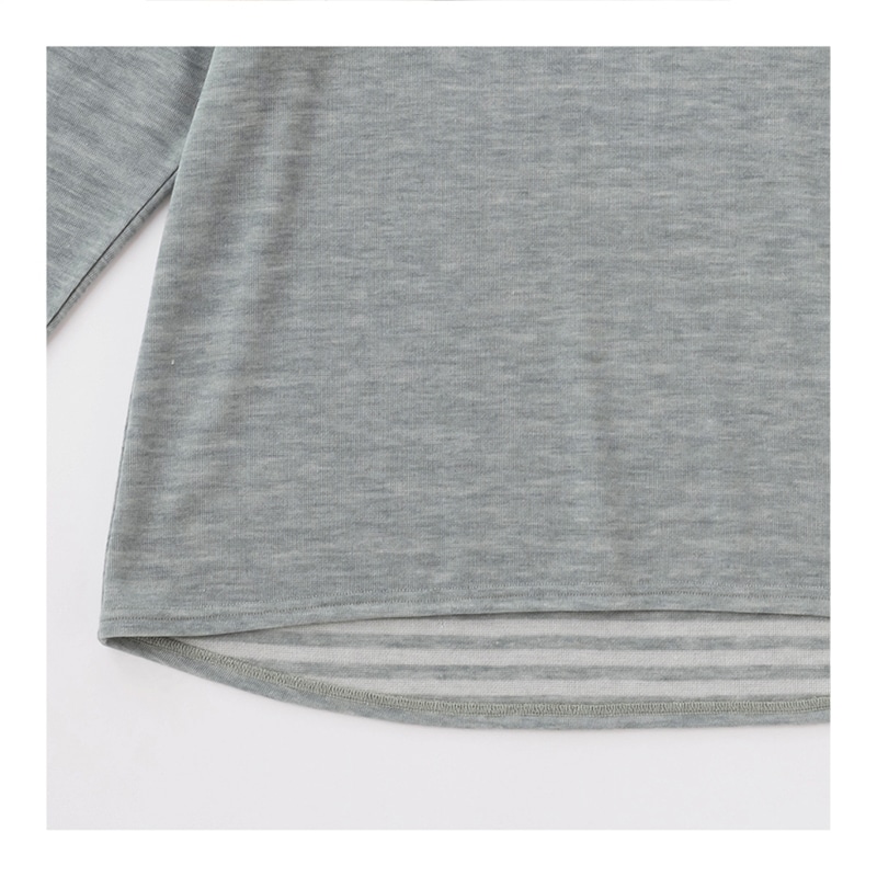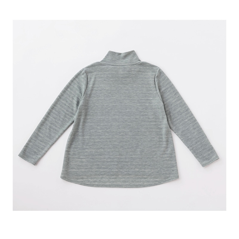 シンプル過ぎず、素材の表情 豊かな接結素材のトップス。 さりげないボーダーやクロス した首元と少し長めの後ろ 身ごろがポイント。やさしいニュアンスカラーは どんなボトムスにも似合います。