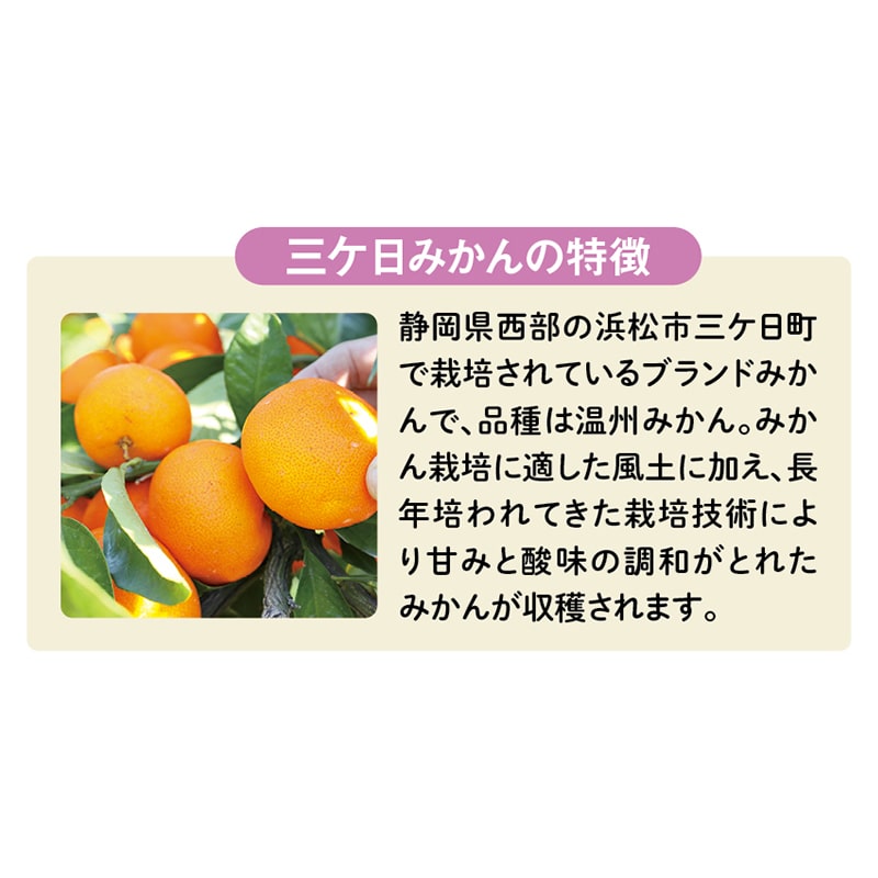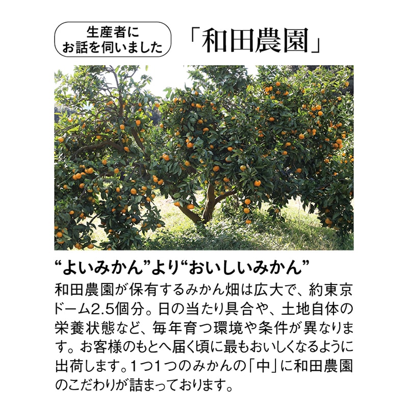 - 静岡県三ケ日町にある「和田農園」のみかんです。三ヶ日町は、豊富な日照量と水はけのよい土壌に恵まれた全国屈指のみかんの産地。和田農園では除草剤は使わず、土地の栄養状態の見極めなど生育環境を日々チェックして丁寧に栽培。目標は「甘さと酸味のバランス」がよいみかんを作ること。このバランスがとれたみかんは「味 に奥ゆかしさが出て甘さに磨きがかかり、柑橘系ならではのすっきりとした味が増す」のだとか。和田農園のこだわりみかんをぜひ、ご賞味ください。