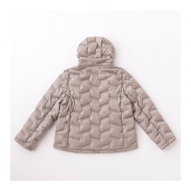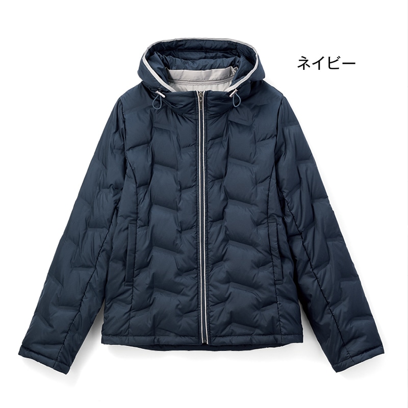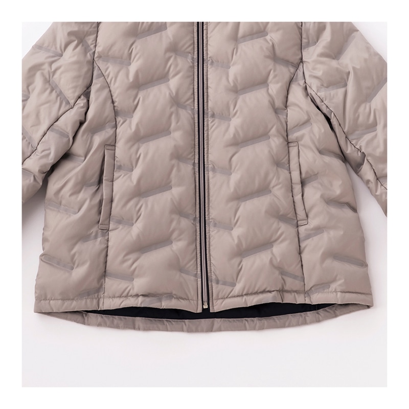 斜めラインはステッチではなく布を 圧縮して中わたが出にくくしたシー ムレスデザイン。軽くてもたつき感 がありません。短め丈ではスカート、 パンツどちらとも好相性。