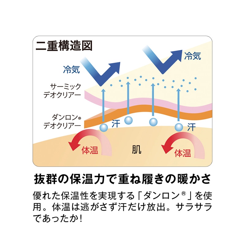 異なる素材による二重構造編みで “重ね履き”と同じ状態の暖かさを1 足で実現。暖かい体温は肌側にキー プし、冷えの大敵である汗や湿気 は外側へ放出。ムレも少なく肌側は いつもサラサラな履き心地です。