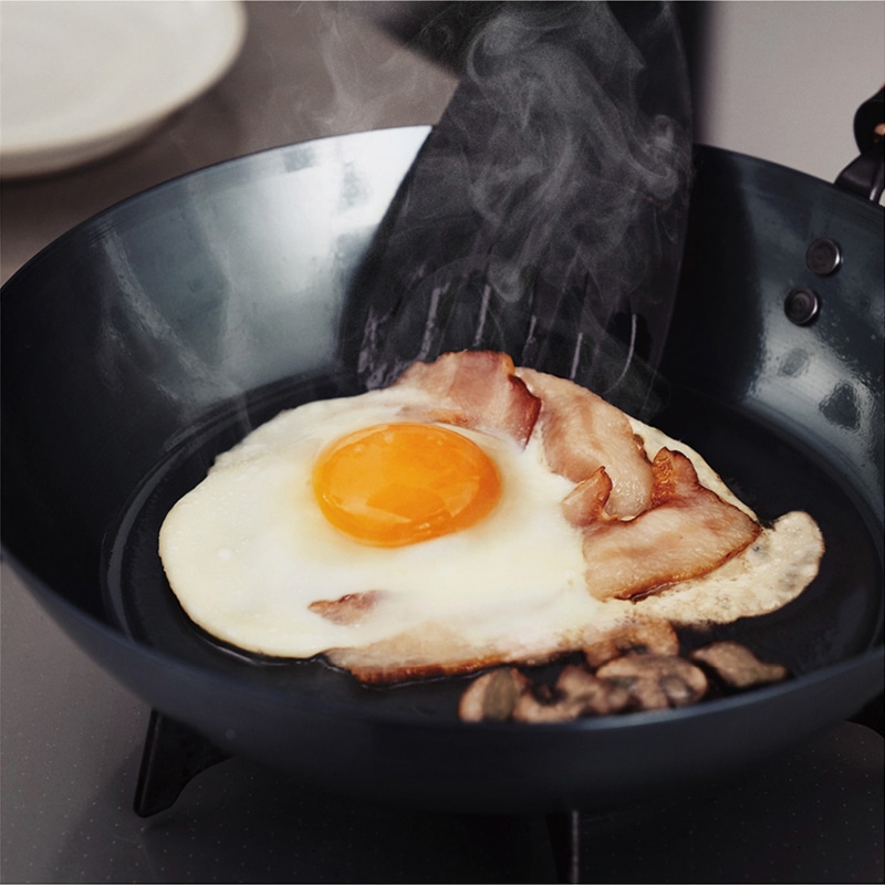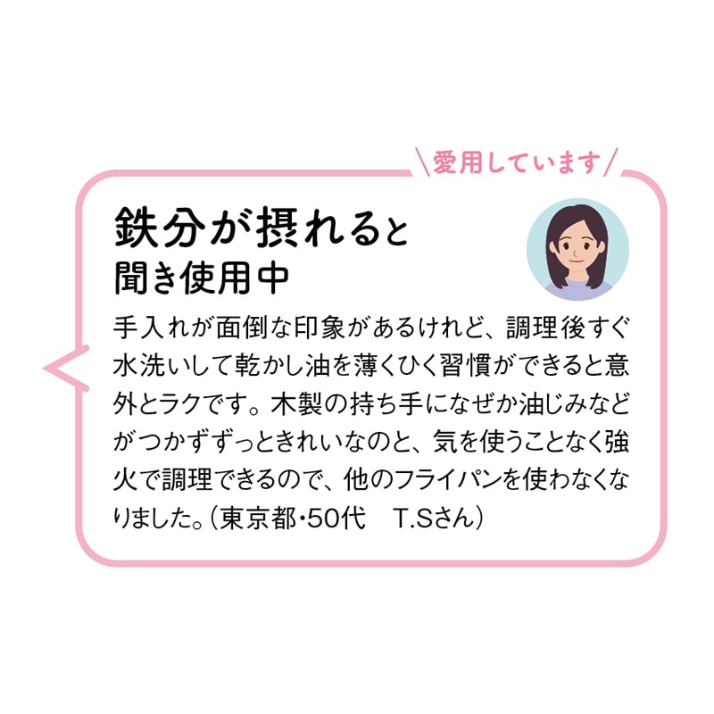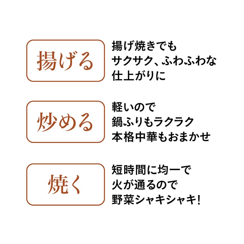 - 鉄のフライパンの弱点である 「重さ」と「手入れが面倒」を解 決した画期的なフライパンです。 優れた加工技術で厚みを極限ま で薄くし、驚きの軽さを実現。 さらに独自加工で鉄特有の「焦 げる・錆びる」も改善。何より 普段のお料理をしながら鉄分が 自然に補給できるから、もう以 前のフライパンには戻れません!