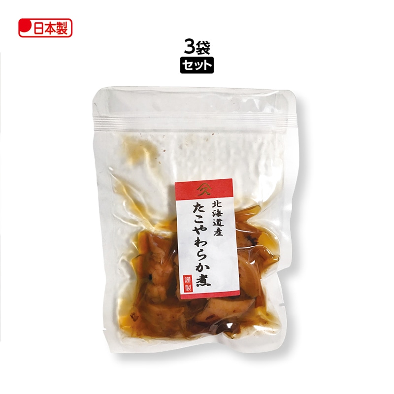 昆布巻きと同じく「山久たかはし」 の商品。最近では珍しい北海道 で水揚げされたたこを一口サイズ にカット。日本伝統の直火焚き により甘辛くコトコト、やわらか く炊き上げました。