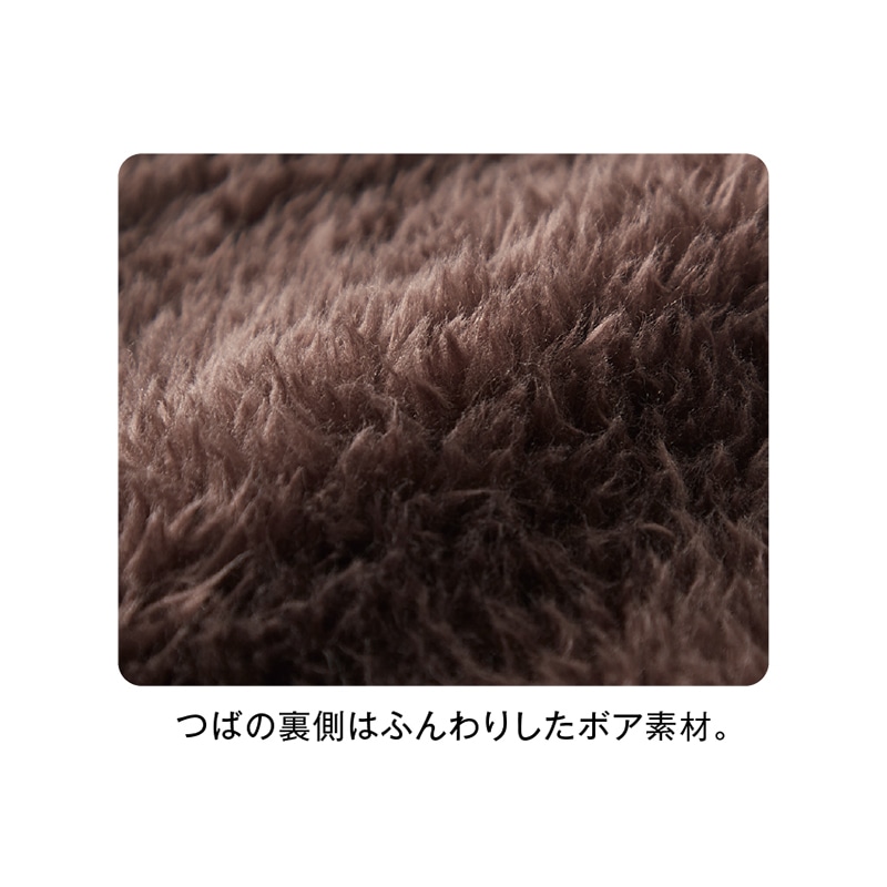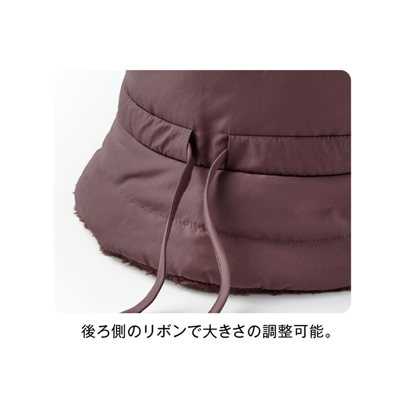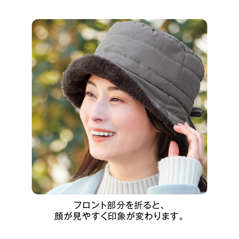 寒さが厳しい季節、裏地がフリースと ボア素材の帽子なら完璧に防寒。深め に被ると小顔見せ効果も。
