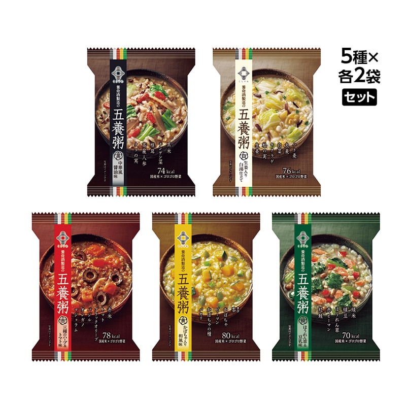 - セット内容/五養粥 黒(19.2g)×2袋、五養粥 白(18.6g)×2袋、五養粥 赤(20.4g)×2袋、五養粥 黄(19.9g)×2袋、五養粥 緑(18.6g)×2袋 特定原材料/小麦、卵、乳成分、魚醤(魚介類) 賞味期限/19ヶ月 製造国/日本  お客様都合の返品・交換はできません。