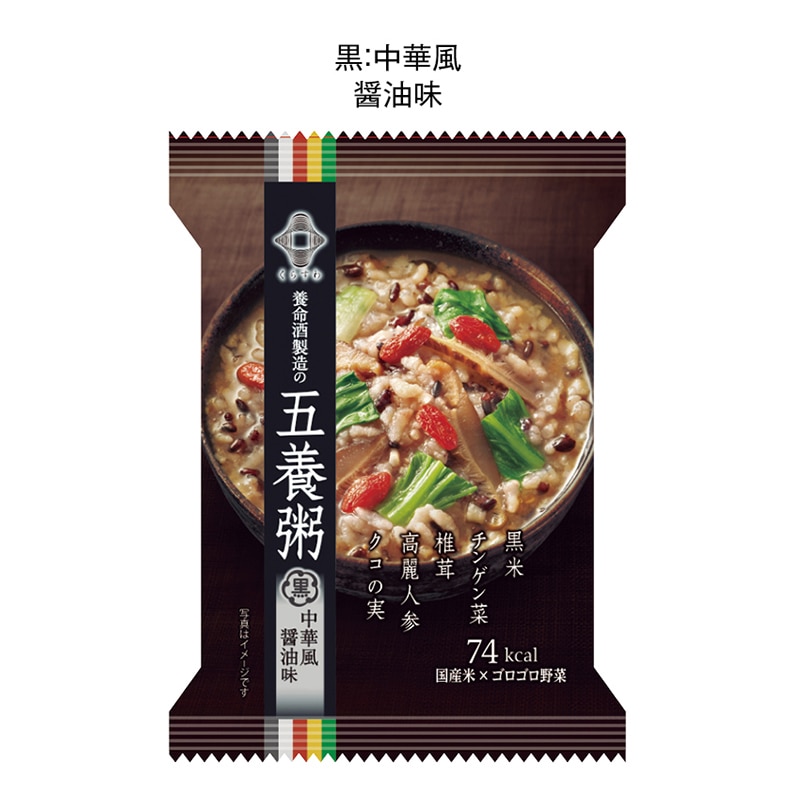 食品原材料/【五養粥 黒】精白米(国産)、チンゲン菜、黒米(国産)、チキンエキス、しょうゆ(小麦・大豆を含む)、おろししょうが、クコの実、でん粉、食塩、ごま油、ほたてエキス、酵母エキス、たん白加水分解物(豚肉を含む)、乾椎茸、ごま、高麗人参、オイスターソース(魚醤(魚介類)を含む)/トレハロース、酸化防止剤(V.E) 特定原材料:小麦、魚醤(魚介類)
