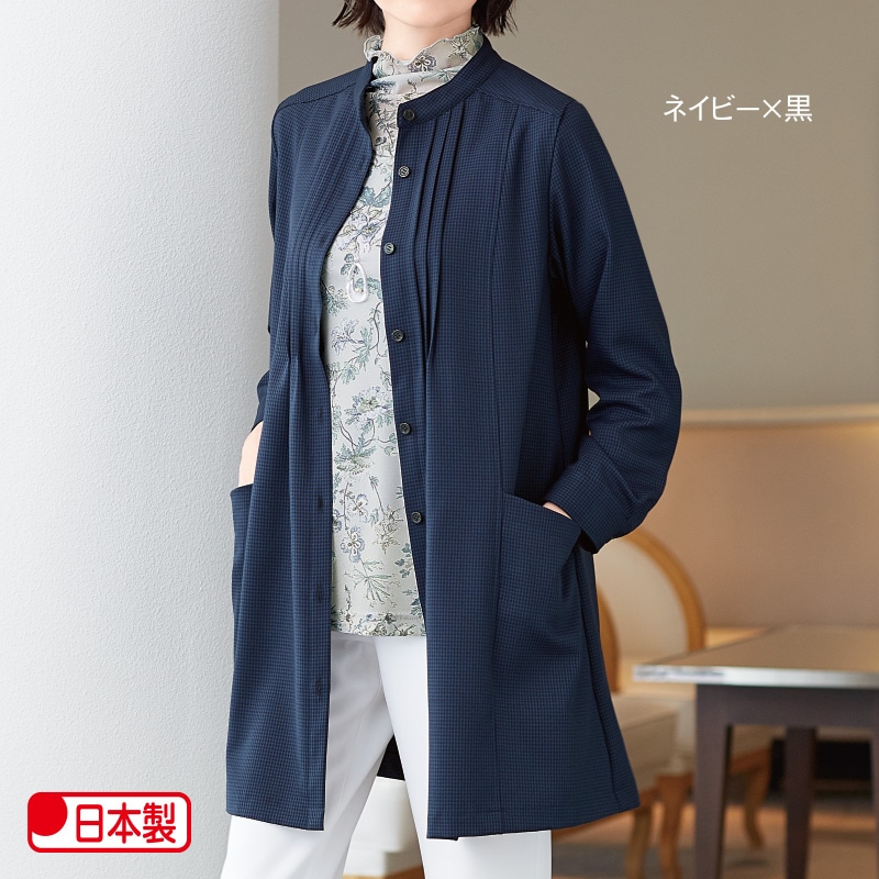 色/ネイビー×黒 素材/ポリエステル100% 仕様/前ボタン全開(8個)、袖口ボタン(各1個)、左右ポケット付き ※後ろ身ごろは前身ごろと同柄です。※アクセサリー、インナー、ボトムスは商品に含まれません。 日本製 *単位(cm) *カッコ内の数値は適応サイズ。手洗い