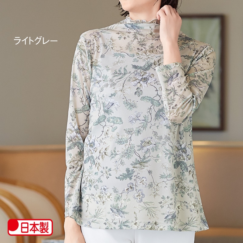 メッシュ素材に花柄をプリントしたプルオーバー。ほどよい透け感で大人の着こなしに映えます。