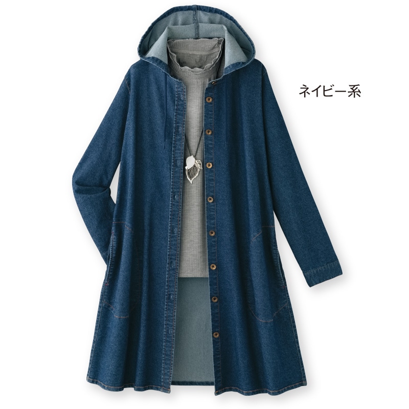 やわらかいストレッチデニムのフード付きロングジャケット。程よく生地の厚みがあるので長いシーズン着用できます。